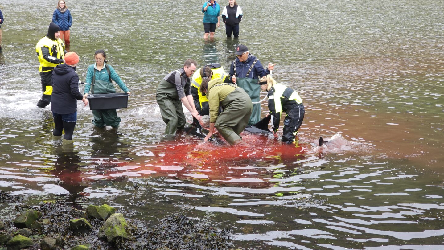 Fitt av fólki stóð á bakkanum eygleiddu, meðan bert tveir hvalir vóru merktir. Sum skilst vóru eisini nøkur umboð fyri Sea Shepard til staðar og eygleiddu.