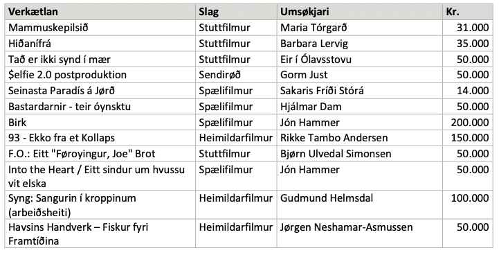 Til triðja stuðulsumfarið í ár, Filmur III. 2025, hevur nevndin í Mentanargrunni Landsins tikið avgerð um at veita hesum 12 filmsverkætlanunum stuðul: