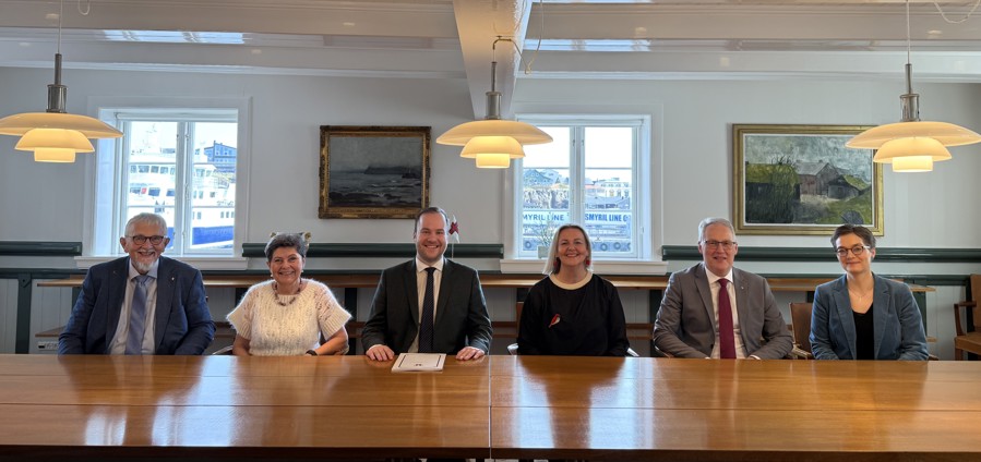 F.v.: Jóan Pauli Joensen, Sólja í Ólavsstovu (forkvinna), Beinir Johannesen (løgmaður), Urd Johannesen, Dan M. Knudsen og Durita Lamhauge Jóansdóttir.