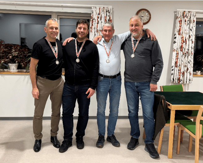 Mynd av liðnum hjá Magna Jøkladal, sum vann gull heiðursmerki í FM lið í bridge. Frá vinstru Magni Jøkladal, Bogi Simonsen, Árni Dam og Símun Lassaberg. Pól Egholm væntar á myndini.