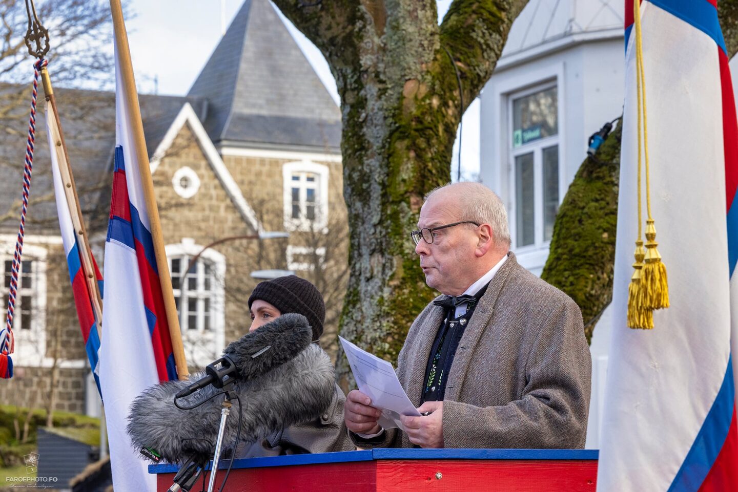 ”Órógv og umskiftilig viðurskifti herja heimin. Trupult er at vita hvat ið vendir upp og hvat ið vendir niður. Hvat ið er reytt og hvat ið er blátt og øvut. Eitt slag av klassiskari imperialismu hevur eisini tikið seg upp fyri eystan og vestan, autokratiskt hugsandi menn ynskja og royna at víðka um egið territorium, og ein avleiðing hjá okkum føroyingum er m.a., at vit hava sett í verk havnastongsul mótvegis einum av samstarvspartnarum okkara. Hvussu vit fara at navigera í eini meiri ókendari framtíð enn annars, tað er ilt at vita, men undir øllum umstøðum kunnu ráðini hjá Gandhi hjálpa okkum: ”…..onki teirra sleppur kortini at taka meg av fótum. Eg verði standandi í egnum jørðildi – á egnari grund.” Tann grundin er treytaleyst fólkaræði.”
