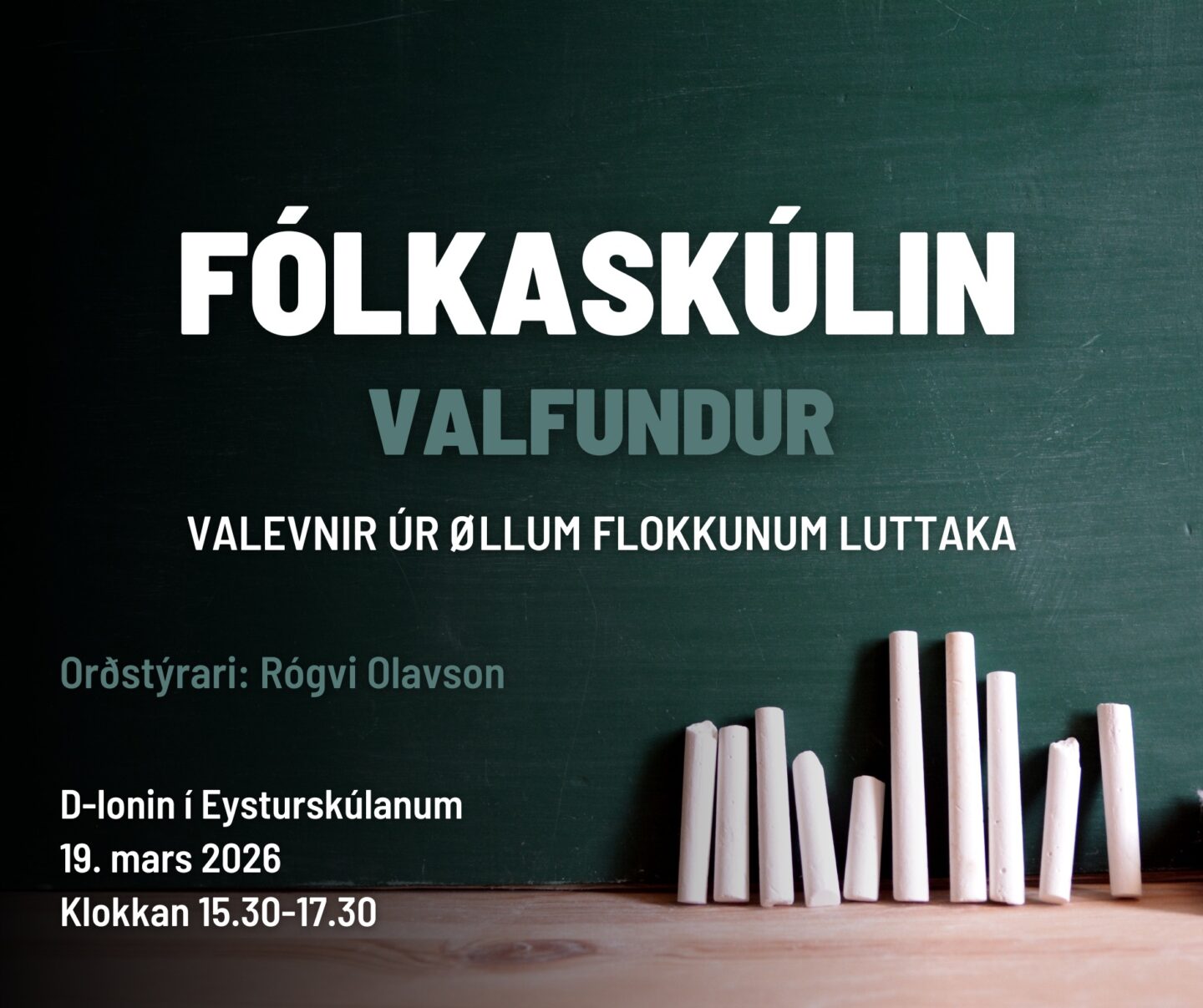 Almennur valfundur um fólkaskúlan verður hósdagin 19. mars kl. 15.30-17.30 í D-lonini í Eysturskúlanum.