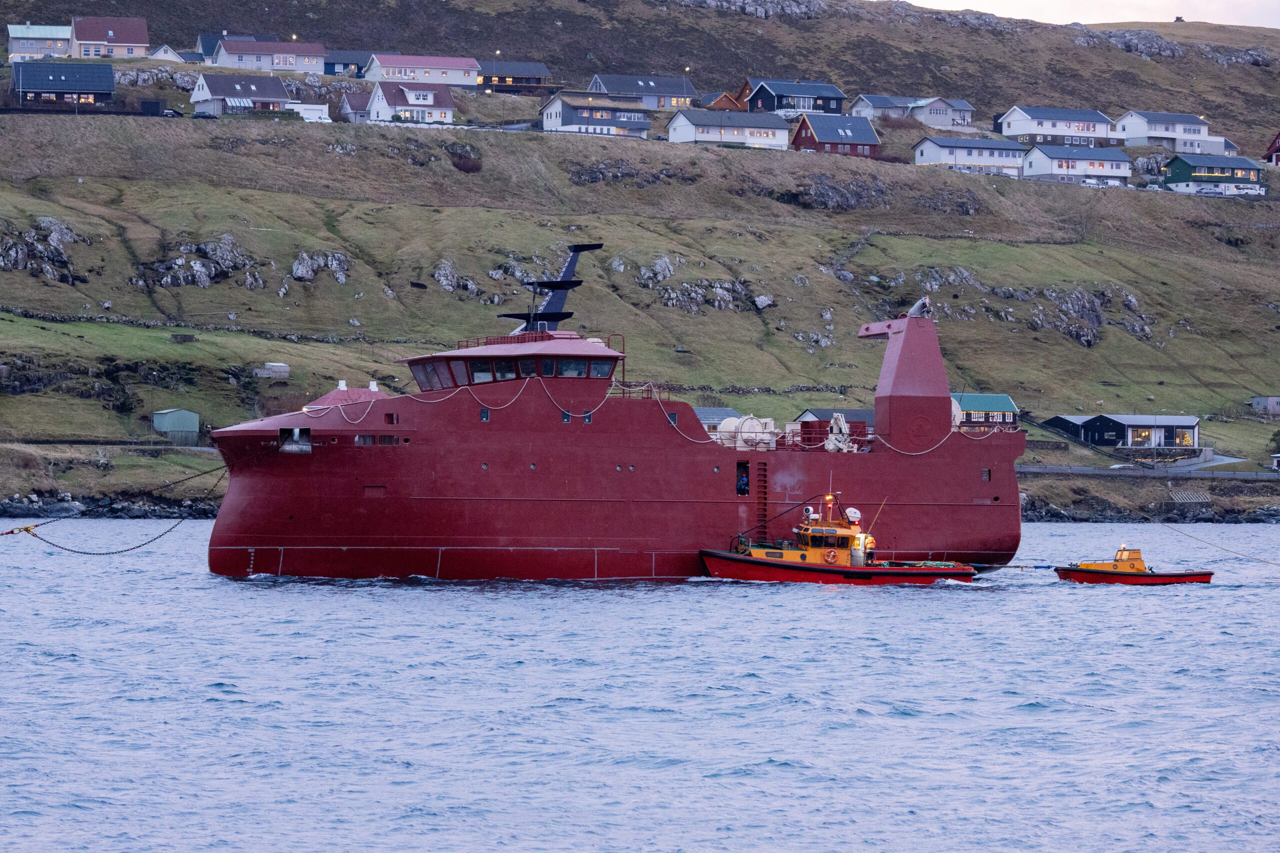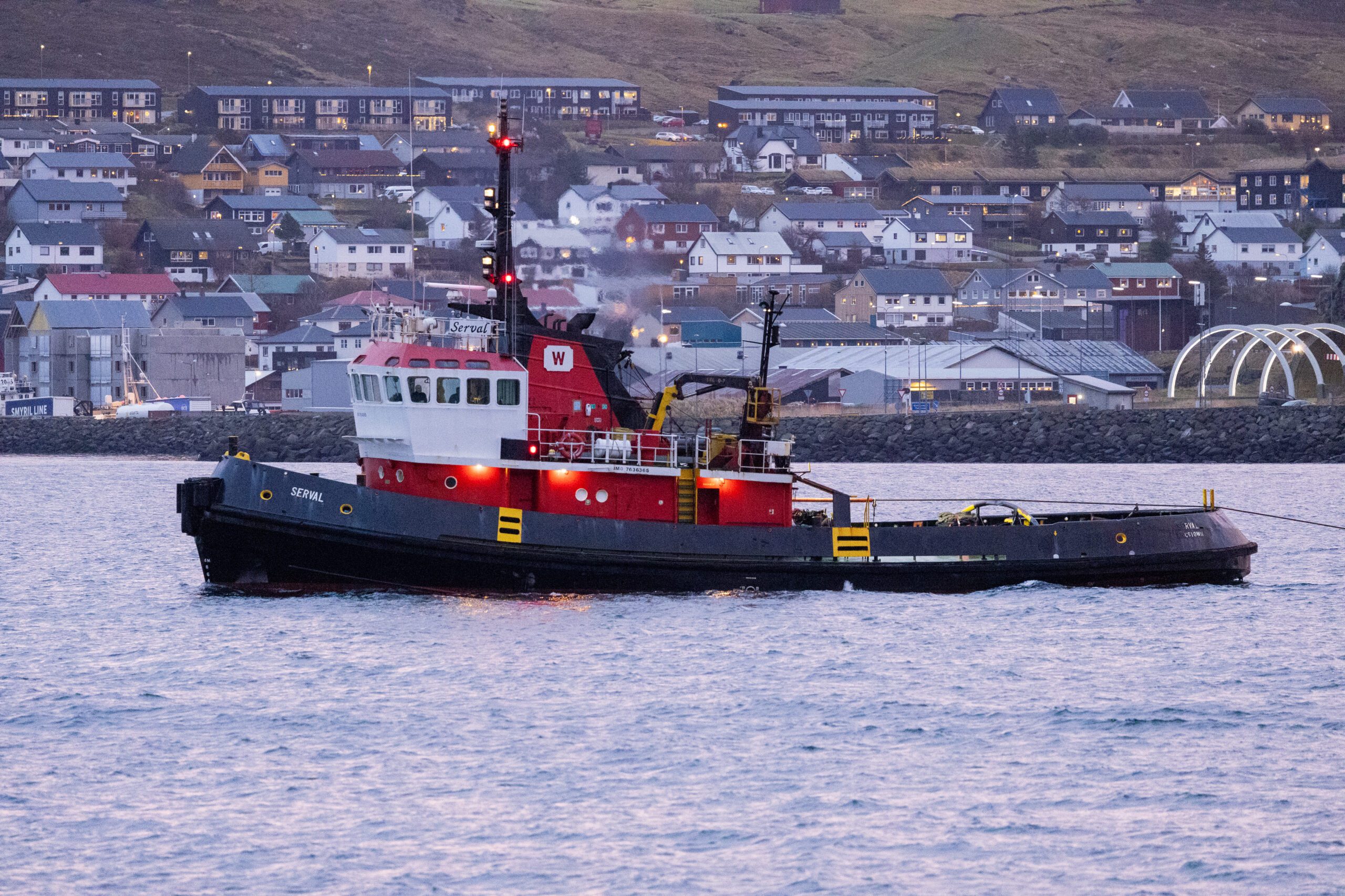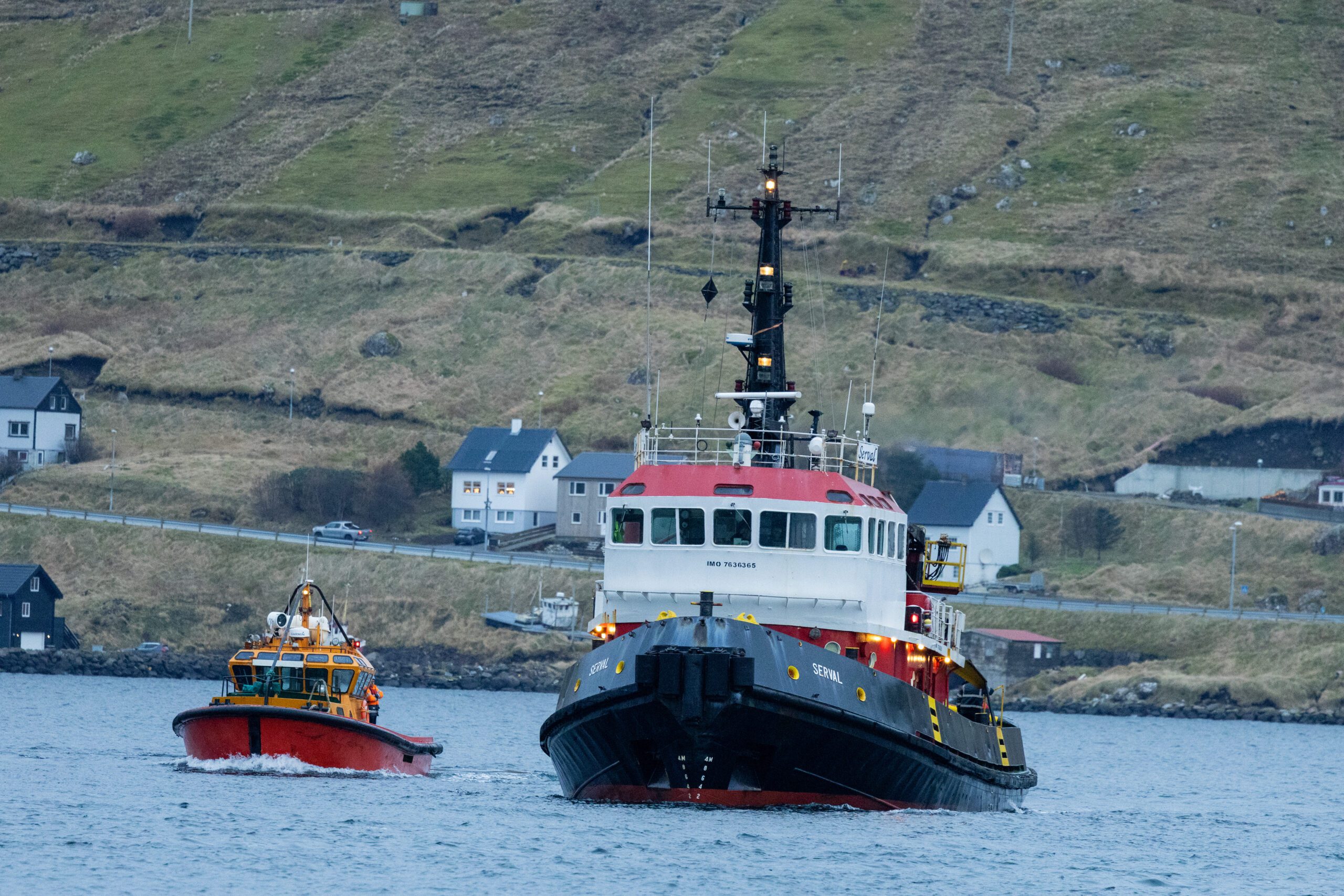 Tað var ein vøkur sjón, tá ið Sleipibáturin Serval M/s hjá MEST, í lýsingini í morgun kom sleipandi inn á Skálafjørðin, við skrokkurin til frystitrolaran Dunga Jákup M/tr.
