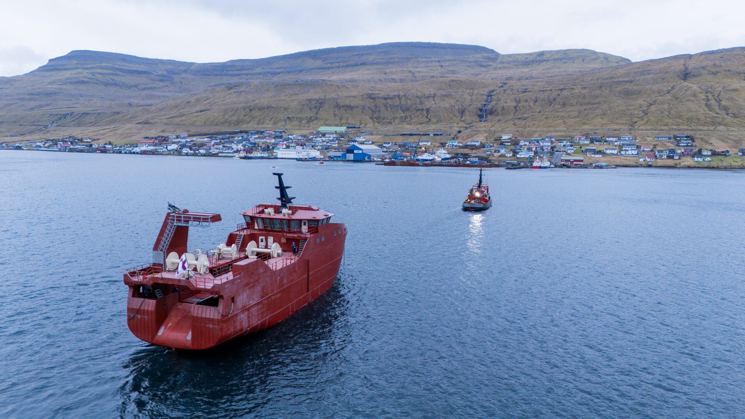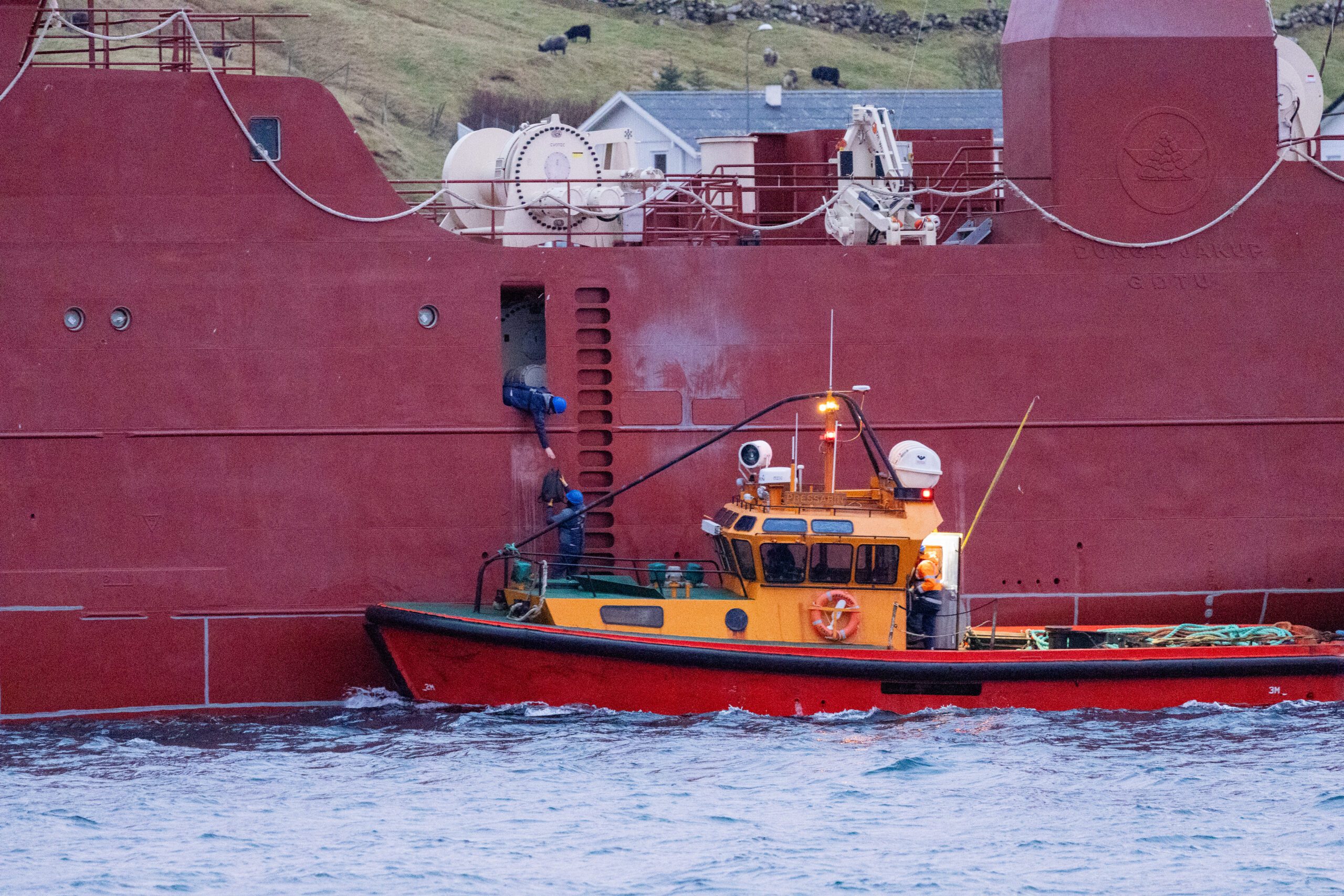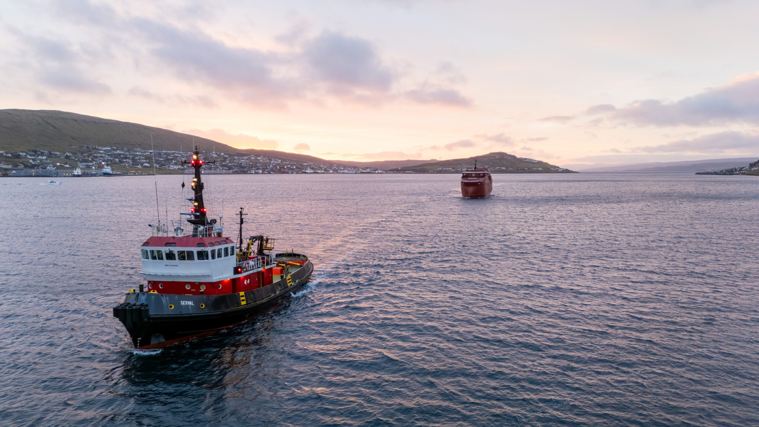 Tað var ein vøkur sjón, tá ið Sleipibáturin Serval M/s hjá MEST, í lýsingini í morgun kom sleipandi inn á Skálafjørðin, við skrokkurin til frystitrolaran Dunga Jákup M/tr.