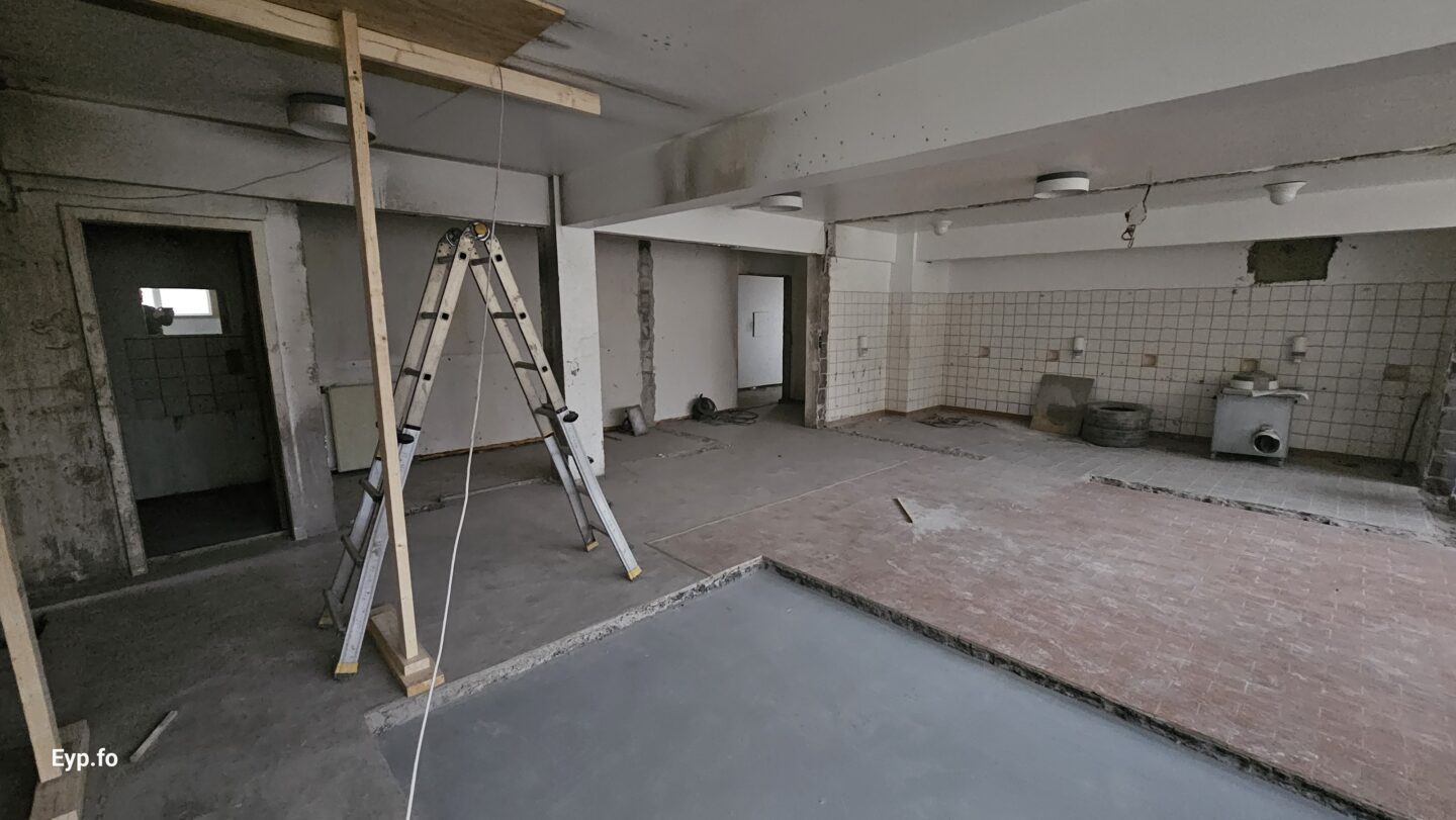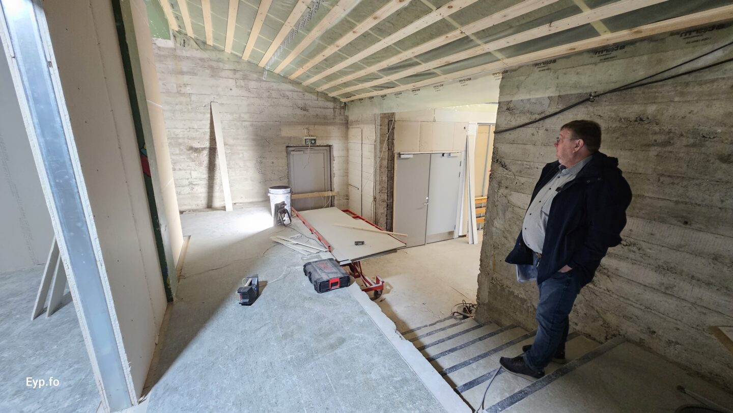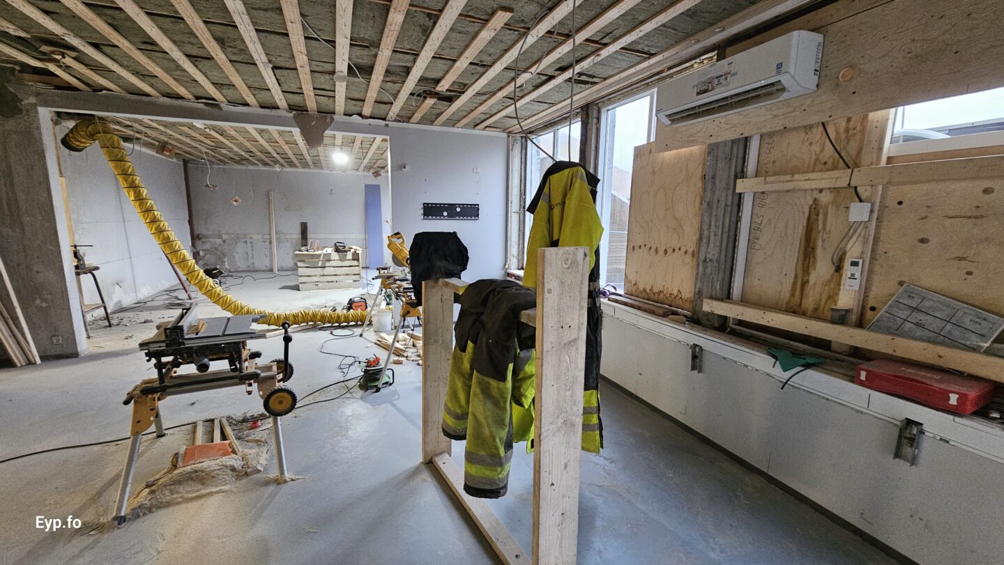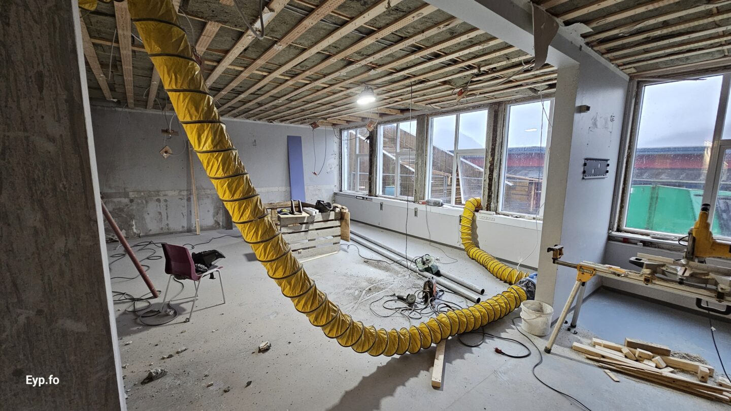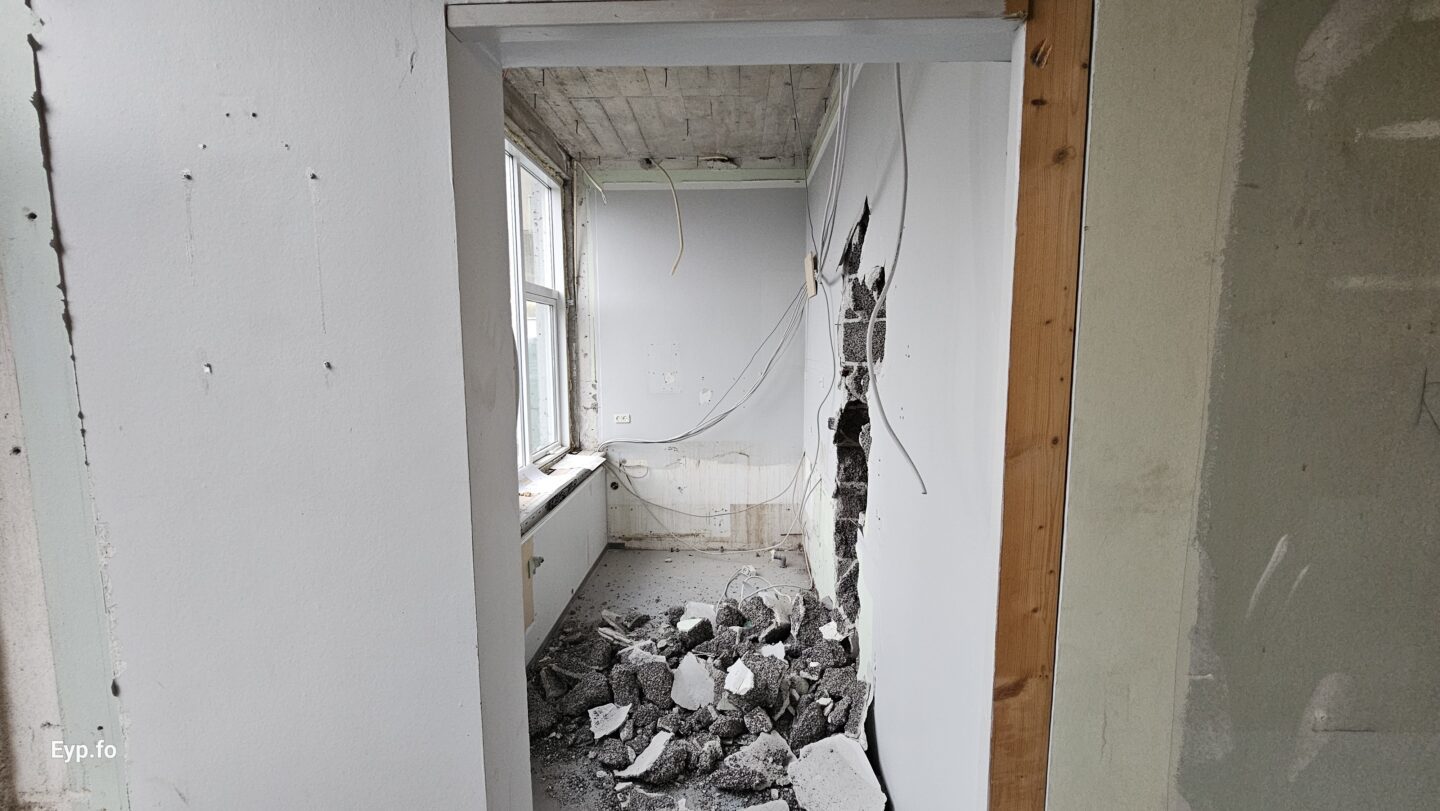 Og í 2023 varð so farið í holt við sjálvt arbeiðið. Byggningurin er bygdur í 1964 og er sostatt yvir 60 ára gamal.