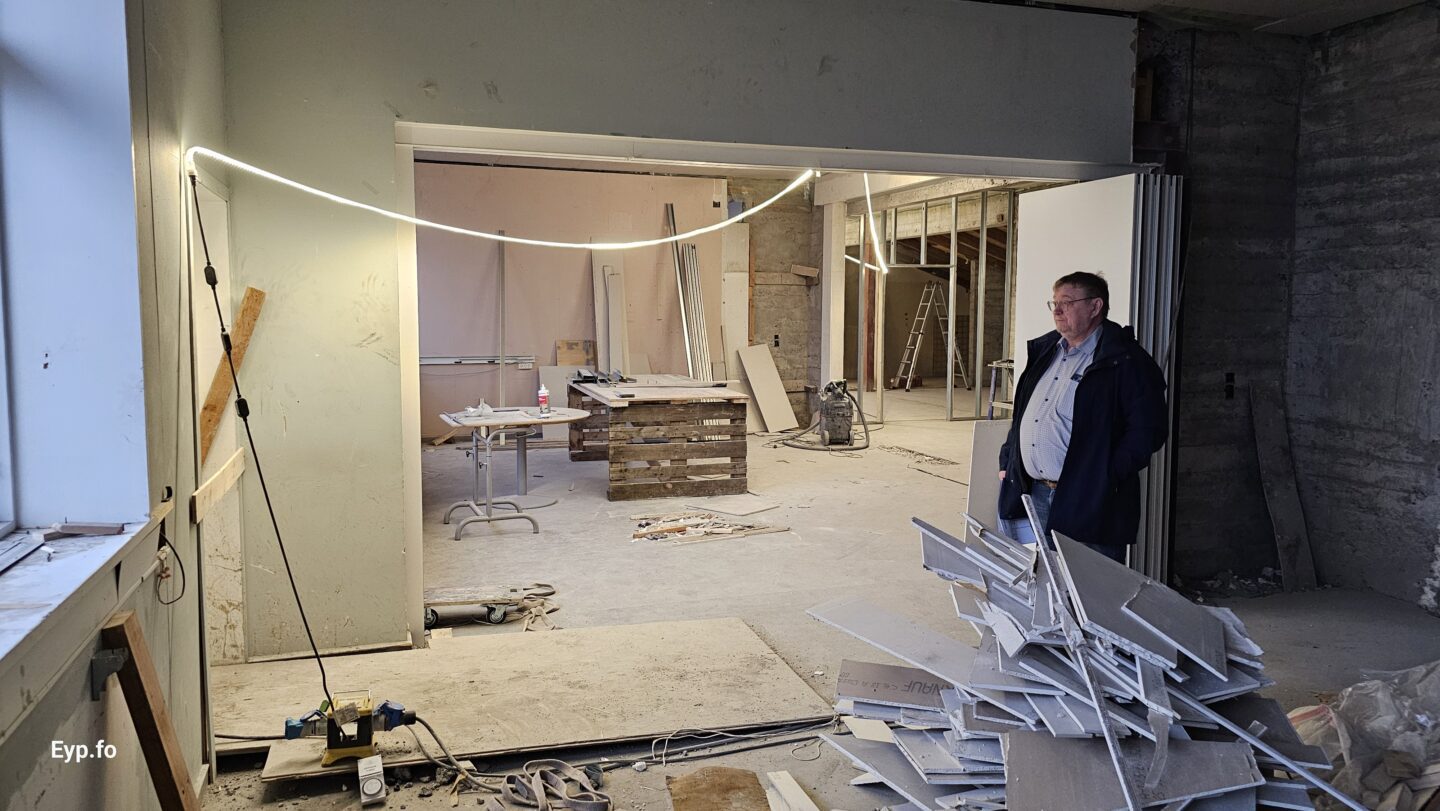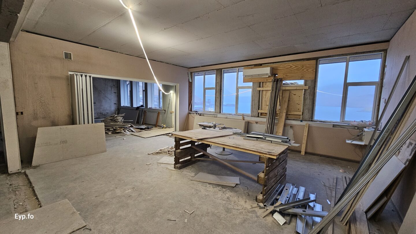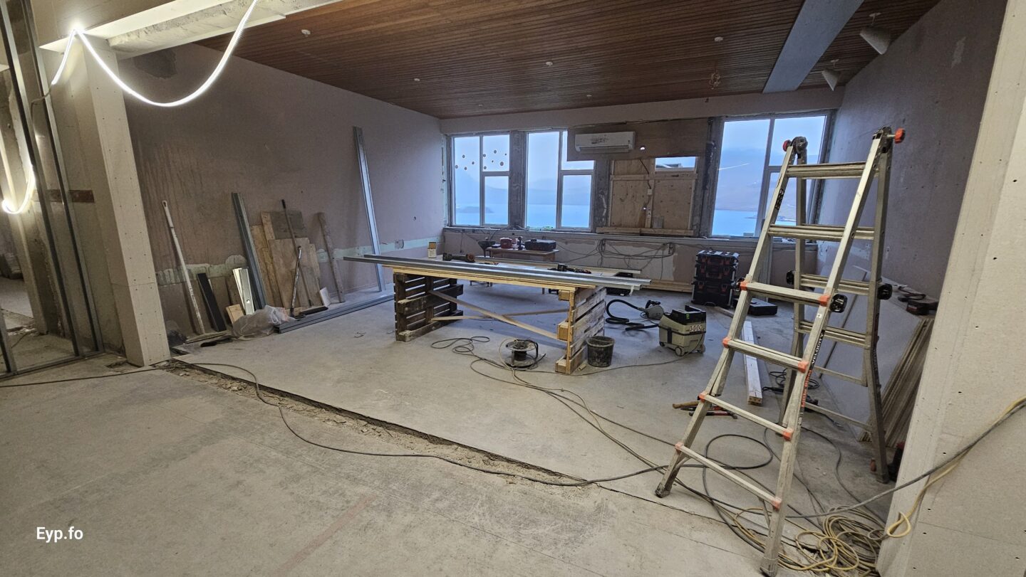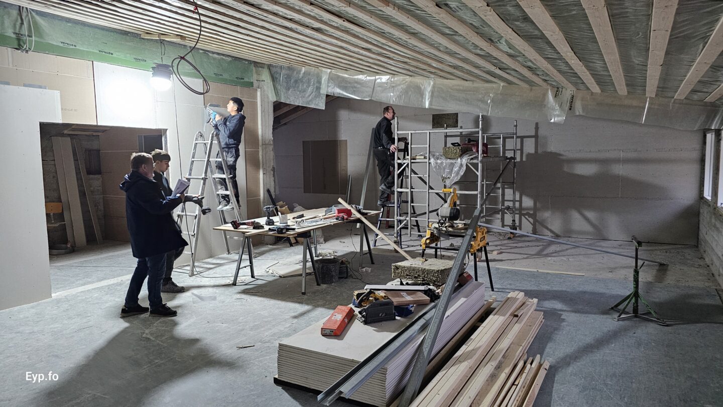 Og í 2023 varð so farið í holt við sjálvt arbeiðið. Byggningurin er bygdur í 1964 og er sostatt yvir 60 ára gamal.