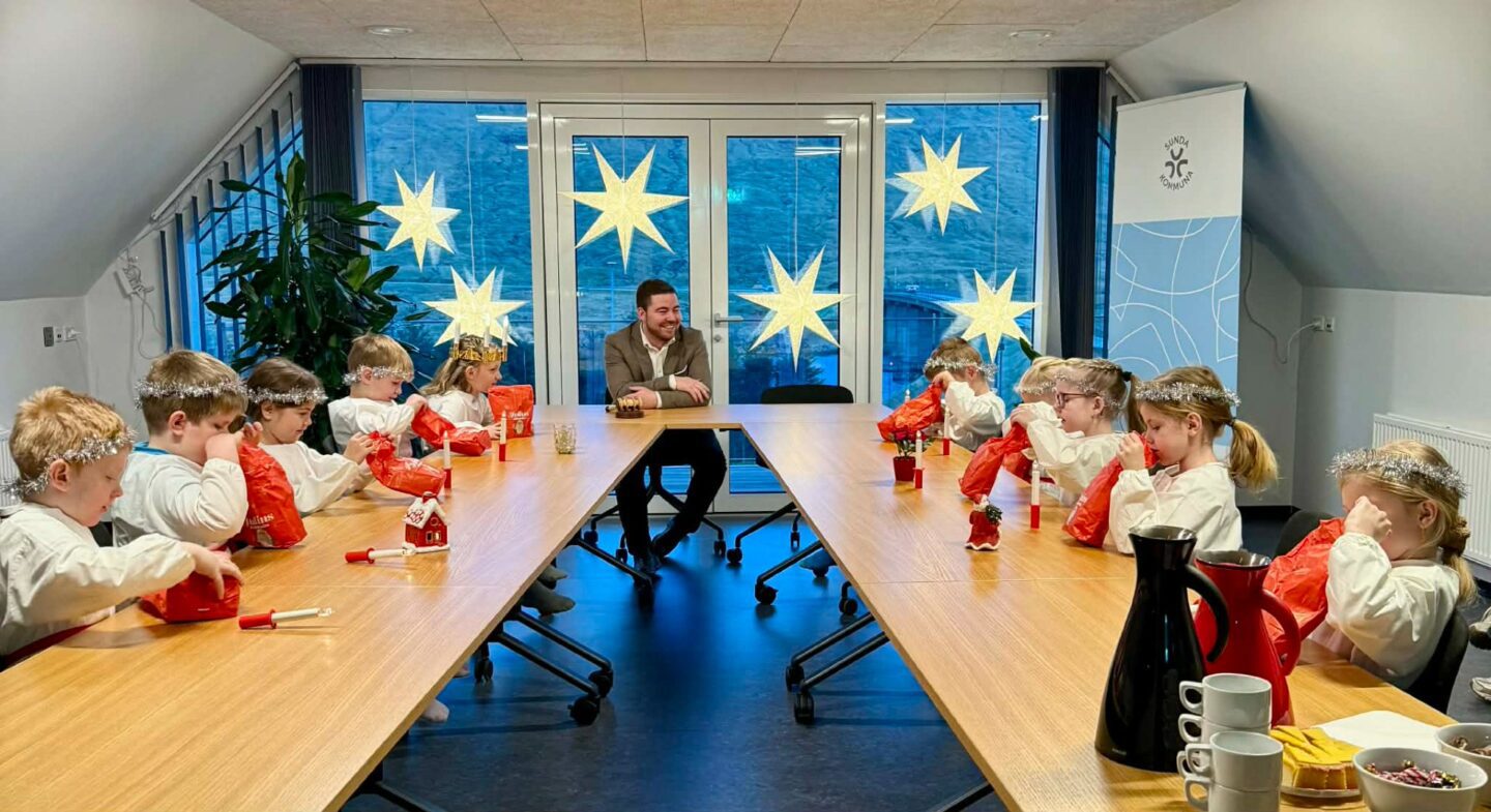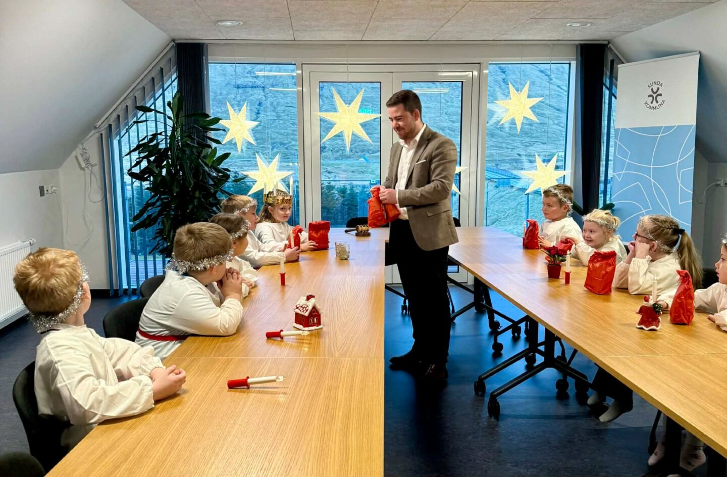 Í morgun høvdu vit sera fitta vitjan av børnum á dagstovninum við Kráir, ið gingu lucia á kommunuskrivstovuni. Aftaná lucia gongdina og jólasang fingu børnini pakka frá borgarstjóranum og eina frágreiðing um hvat kommunan ger.