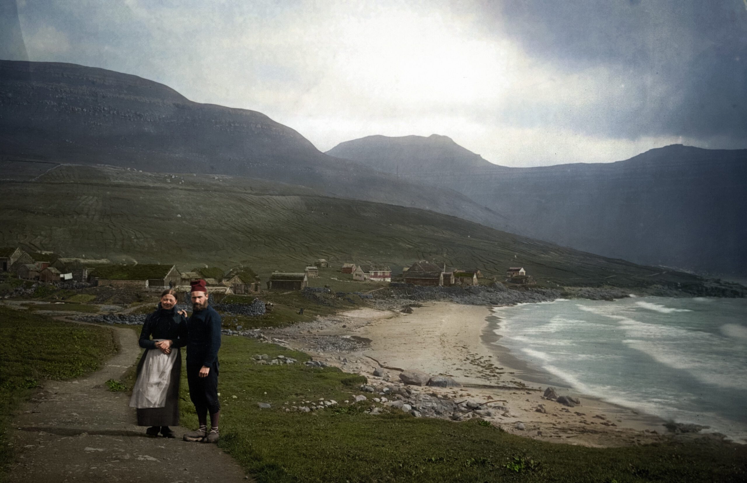 Áðrenn verndargarðurin varð bygdur, gekk bakkin valla beint oman á sandin. Mynd: Johannes Klein 1898