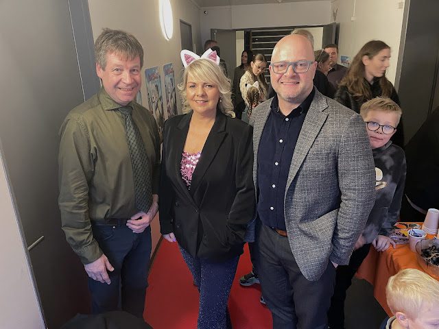 Magnus Dam, Kringvarpsstjóri, lovar í inngangsrøðu, at nú verður roynt at fáa føroyska talu á meir enn ein film um árið. Tað er so ambisjónin, sigur Magnus, uttan at lova nakað. Her sæst hann saman við Páll Danielsen og Jonnu Mortensen.