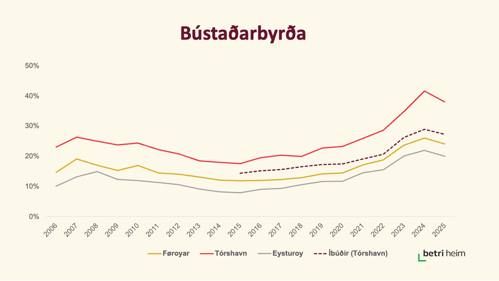 Fyri sethús var bústaðarbyrðan í fjør 38% í Tórshavn og 20% í Eysturoynni. Tað er ein lækking samanborið við 2024, tá bústaðarbyrðan var ávikavist 42% og 22%.