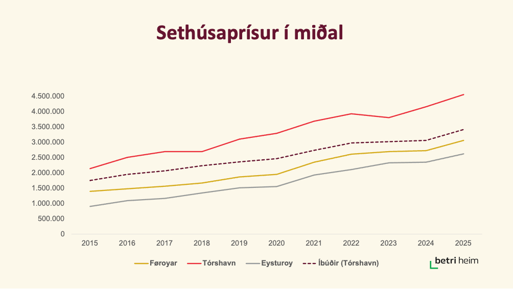 Í Tórshavn var miðalprísurin í fjør 4,6 milliónir krónur samanborið við 4,2 milliónir krónur í 2024. Tað er ein vøkstur upp á 10%.
