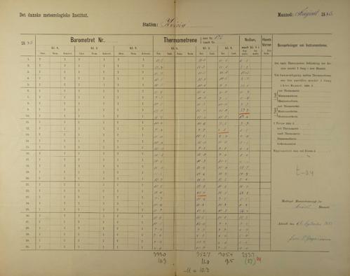 Mynd 1: Fyrsta arkið við veðurskrásetingum, sum IPG sæst at hava váttað. Umframt hitan og avfall, sum er á hesum arkinum, skrásetti hann eisini skýloftið, ætt og vindmegi.