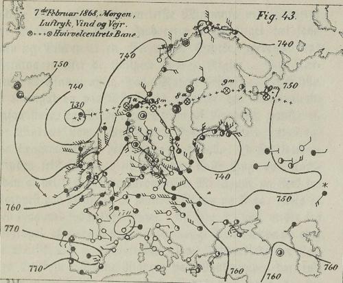 Mynd 2: Eitt av fleiri veðurkortum í bókini ‘Om Vind og Vejr’ eftir Henrik Mohn, sum kom út í 1872. Gevið gætur, at ein av mátingunum, sum kortið byggir á, er í Føroyum, og at um morgunin hendan dagin, tann 7. februar í 1868, lá eitt lágtrýst yvir Føroyum. Á kortinum er teknað inn væntaða leiðin hjá hesum lágtrýstinum næstu dagarnar.