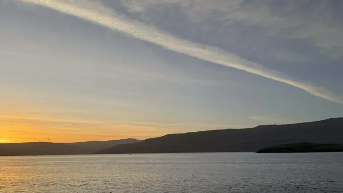 Sólin reis úr havi í morgun klokkan 09.31 í næstan beinum landsynningi (138°). Tá ið hon fór í kav seinnapartin klokkan 15.41 var tað í næstan beinan útsynning (223°). Vit siga, at Sólin rísur í eystri og setur vestri, men tað er bert heilt satt, tá ið tað er várjavndøgur og heystjavndøgur. Lærari í astronomiskari siglingarlæru plagdi at siga, at “…i østen stiger solen op, passar bara tvær ferðir um árið”. Mynd: Jari í Hjøllum.