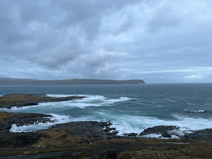 Veðrið 12. januar. Slavin luft úr miðjum Norðuratlantshavi rak ímóti Føroyum. Skýloftið kendist í støðum tungt, serliga um fjallatindarnar. Ikki nógvur vindur, tó frískur í støðum við einum sindri av brimi. Mynd: Vilma Poulsen.