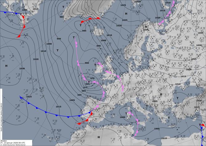Støðumynd 23. januar klokkan 00. Øll veðurkortini seinast 2 vikurnar av januar sóu soleiðis út – ella næstan. Eitt stórt hátrýstøki úr Norðurskandinavia allan vegin til Grønlands, og lágtrýstini gingu eystur ímóti Írlandi, har tey gryntust og gjørdu alt avfallið av sær. Yvirhøvur var vindurin eitt sindur meiri, enn plagar at vera, tá ið vit liggja so nær einum hátrýsti. Lágrýstini trýstu seg ímóti hátrýstinum og fekk trýstmunin á okkara leiðum at veksa. Á kortinum síggjast javntrýstlinjurnar við Føroyar vera tættar. Mynd: Deutcher Wetterdienst