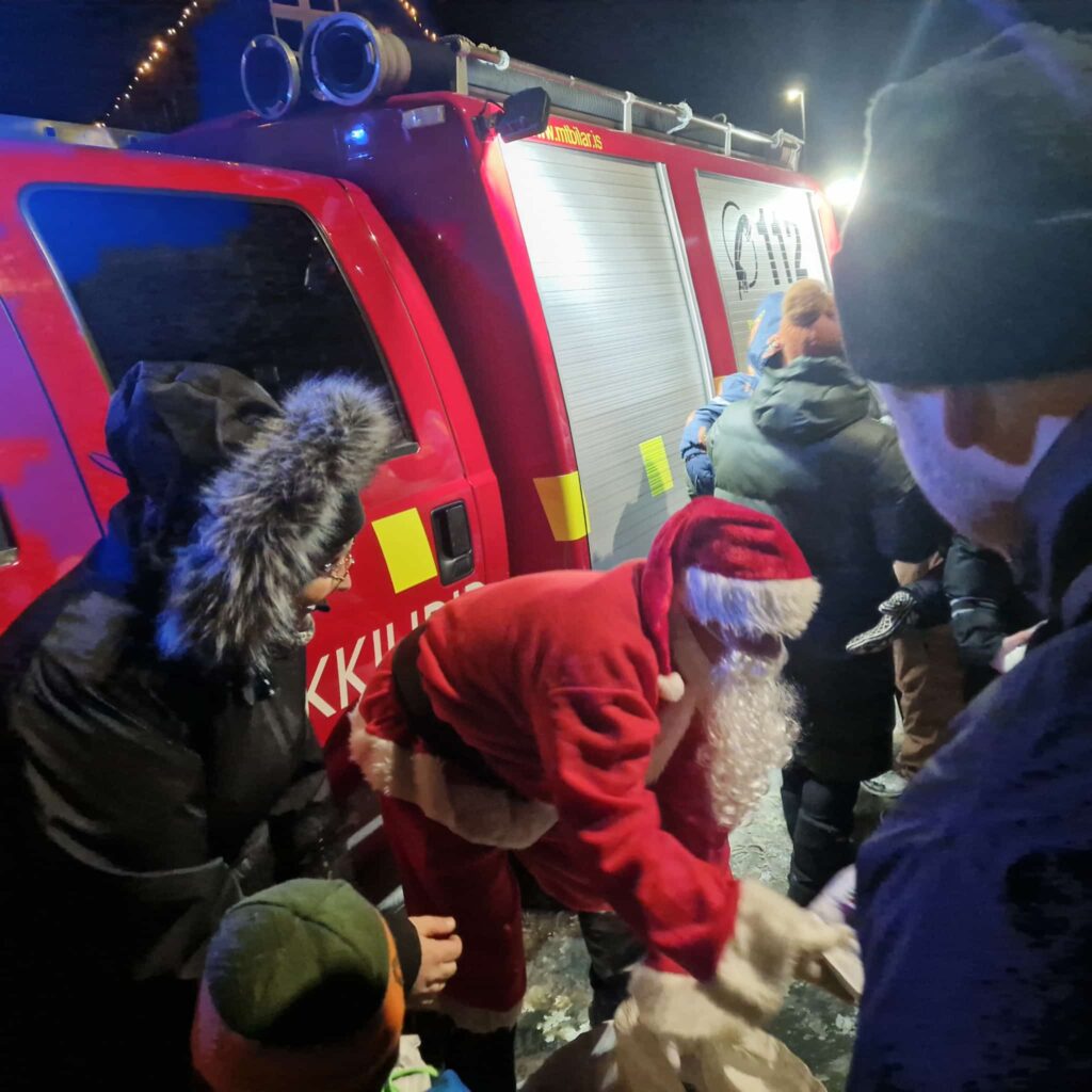 Løtu seinni kom róp í millum børnini, tá tey gjørdust varug við brannbilin, ið kom ýlandi oman ímóti bygdini. Jólamenn góvu børnunum pakkar við góðgæti og eftir hetta bjóðaði kommunan til kakao og bollar, ið ivaleyst kom væl við í heldur kalda veðrinum.