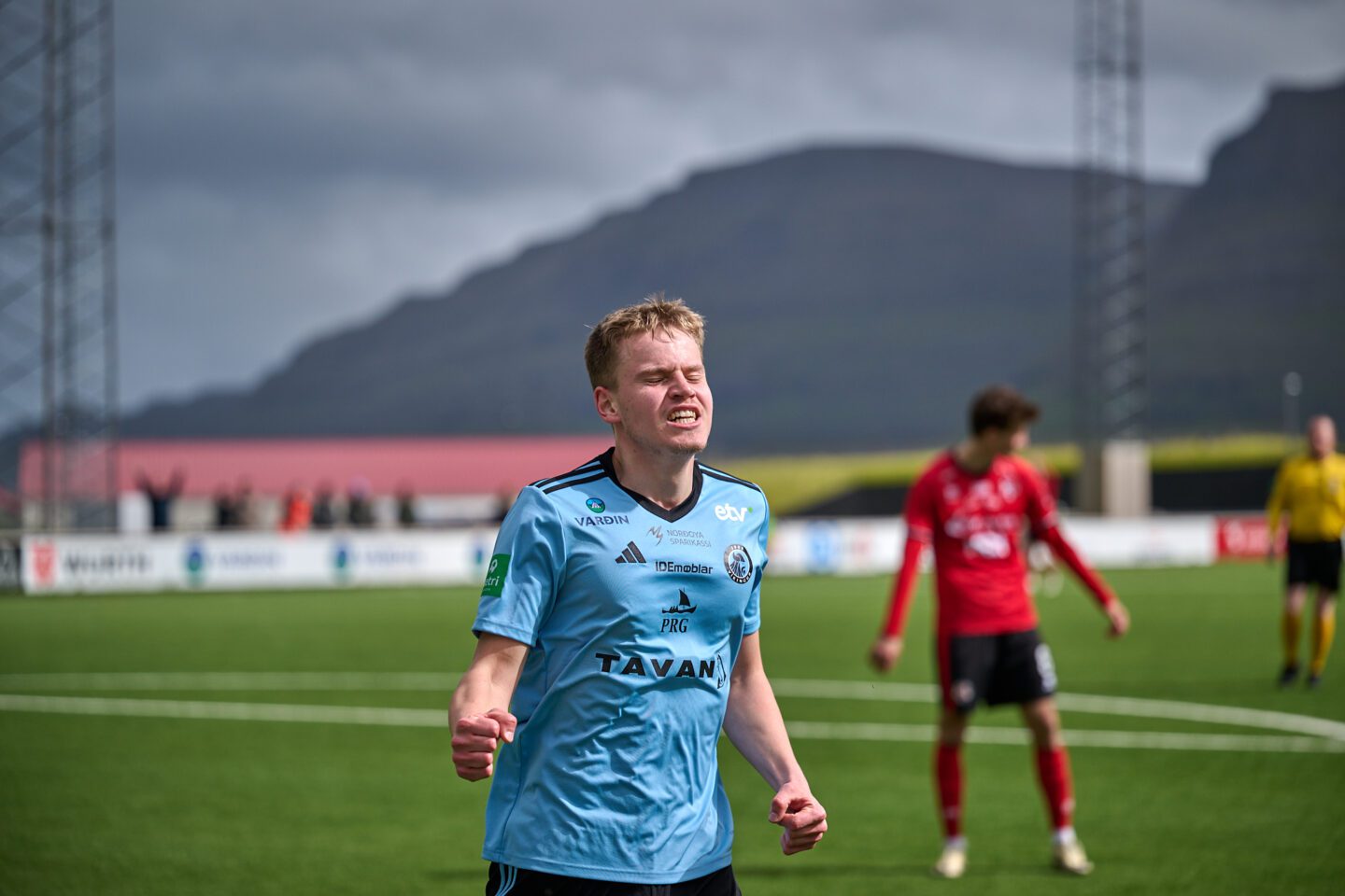 Glyvramaðurin tekur eitt ár afturat í ljósabláu troyggjuni.