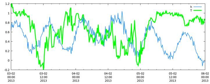 Flóð og fjøra í Klaksvík 3. til 6. februar 2013. Hyggjandi eftir bláu strikuni  sæst, at tað fløddi fyrrapartin 4. februar, og beint eftir klokkan 12 var full flóð. Næstu tímarnar – fram ímóti klokkan 18 – fjaraði ikki, sum tað plagar at gera. Tað gingu meiri enn 4 tímar, áðrenn tað fór at fjara.