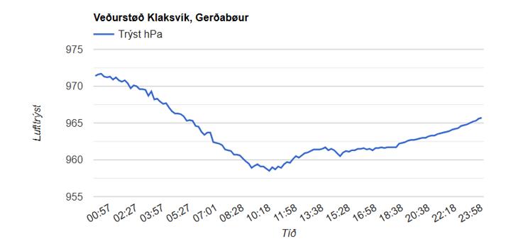 G.G.: Allar veðurstøðirnar hjá Landsverki eru í 10 metrar hædd, og mastrafóturin er 20 metrar oman fyri sjóvarmálan. Tí skulu vit leggja 4 hPa aftur at tølunum fyri at fáa lufttrýstið við hædd 0 (null).