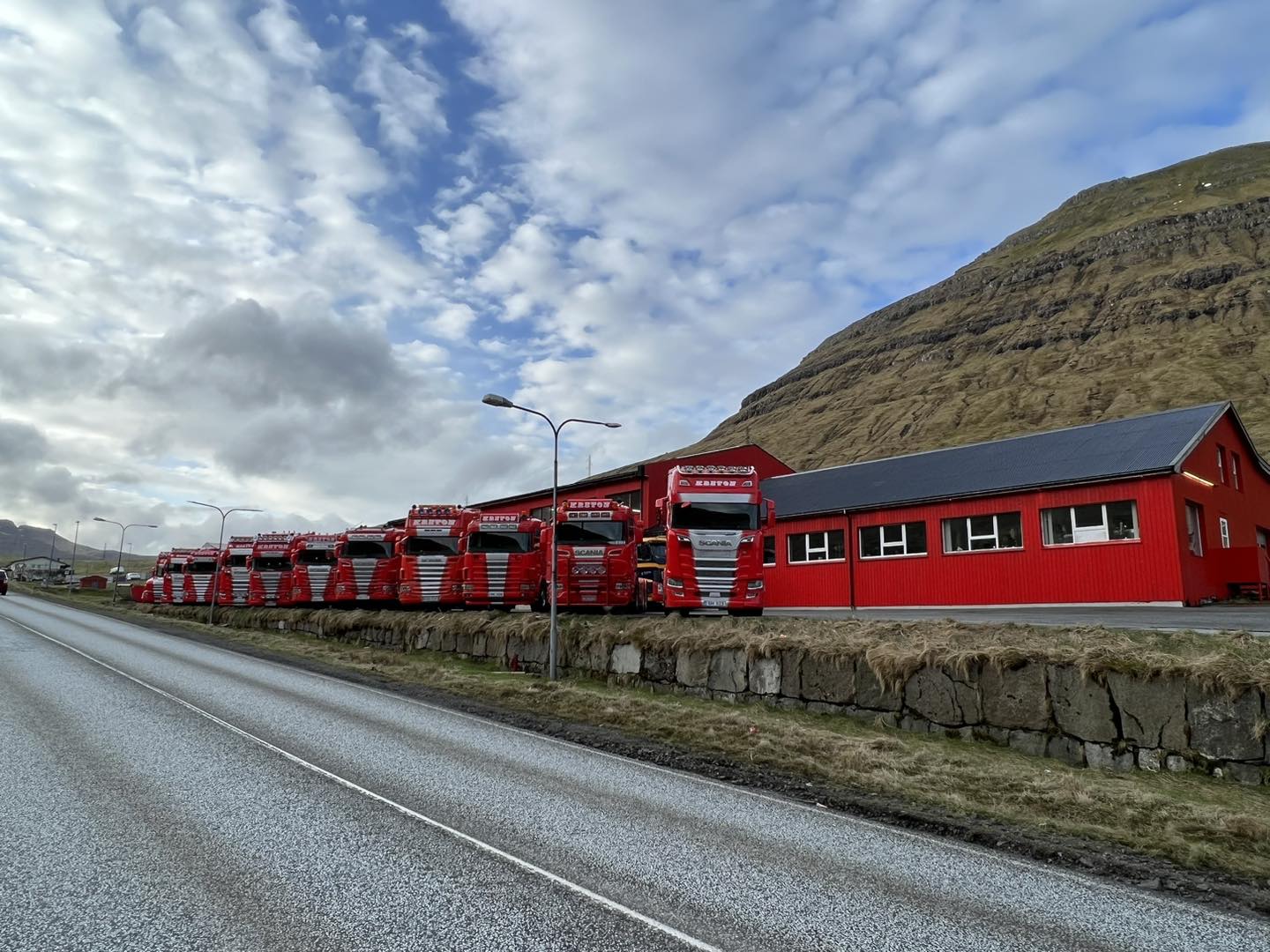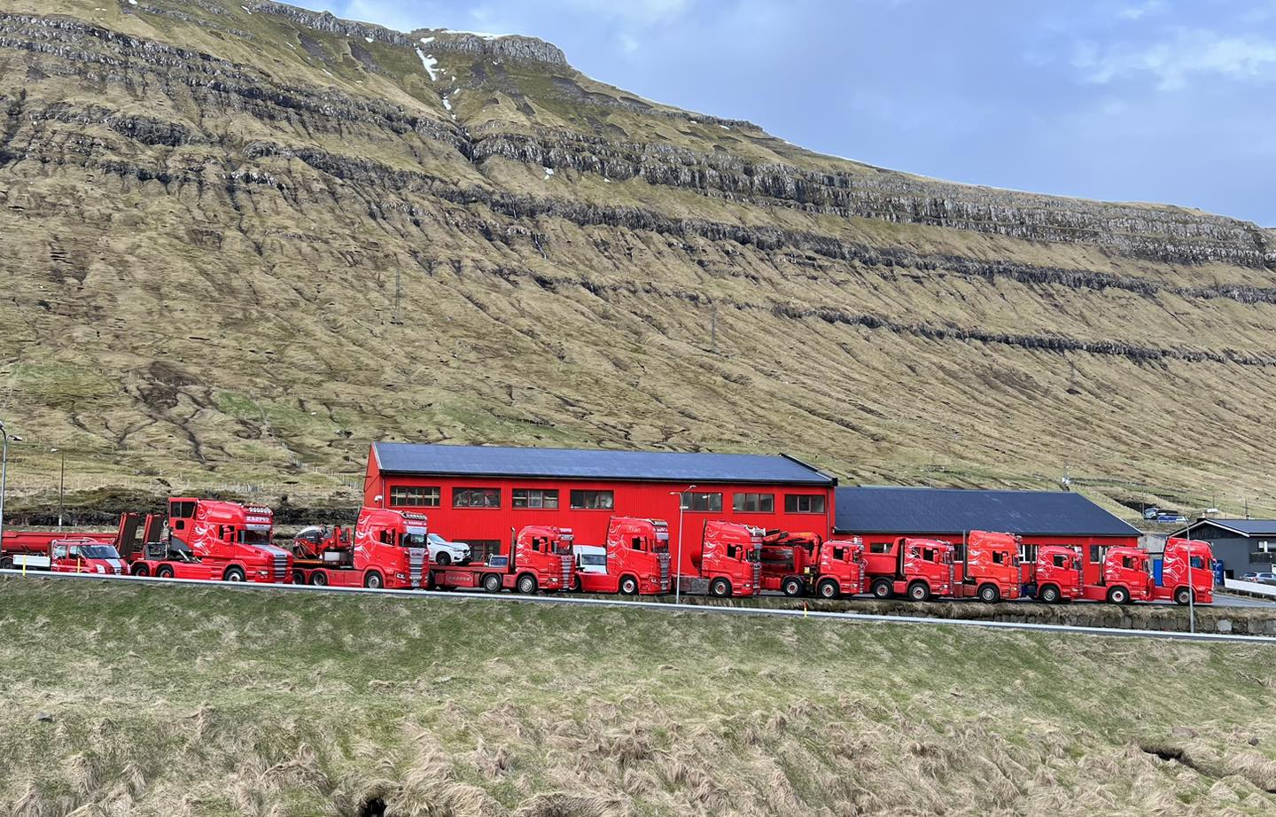 Reyðu lastbilarnir og reyði bygningurin inni í Dalinum í Norðragøtu (Mynd: Kreton)