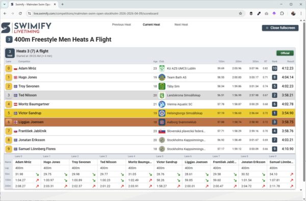 Tey brúka eina skipan við tveimum umførum av innleiðandi riðlunum, nú í Stockholm har svimjarar við spakuligari tilmeldingartíð bíða til seinni í morgun við at svimja. Tað er sjálvsagt gjørligt at onkur tá svimur skjótari enn Líggjas; men annars sær tað út til at hann varð nr 14 í innleiðandi, í hesi sera hørðu kapping.