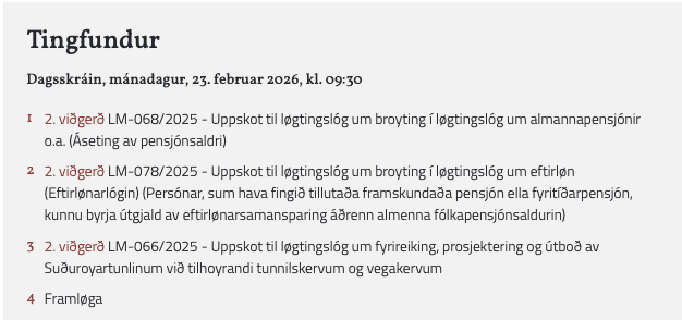 Løgtingsfundur: Pensjónsmálið og Suðuroyartunnilin á skrá