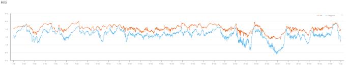 Hitalagið (tann reyða strikan) var javnt fyrstu 3 vikurnar. Lá um 5 stig og fór bert 1-2 stig uppum ella niðurum. Seinastu 10 dagarnar var tað meira óstøðugt, fór niður í frostmarkið nakrar dagar, og so uppaftur í 5 stig. Luftin var sera slavin næstan alla tíðina, og tað sæst á reyðu og bláu strikunum, tí tær eru so tættar næstan alla tíðina. Kelda: Veðurstova Føroya.
