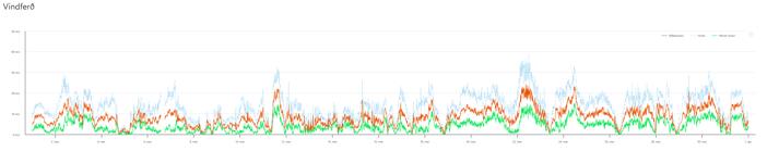 Tann reyða strikan í miðjuni er miðalvindferðin. Hon fór nakrar ferðir upp um 20 m/s, og bert ta ein ferðina var løtan drúgv – tað var 22. mars. Annars var vindferðin 10 m/s ella minni. Kelda: Veðurstova Føroya.