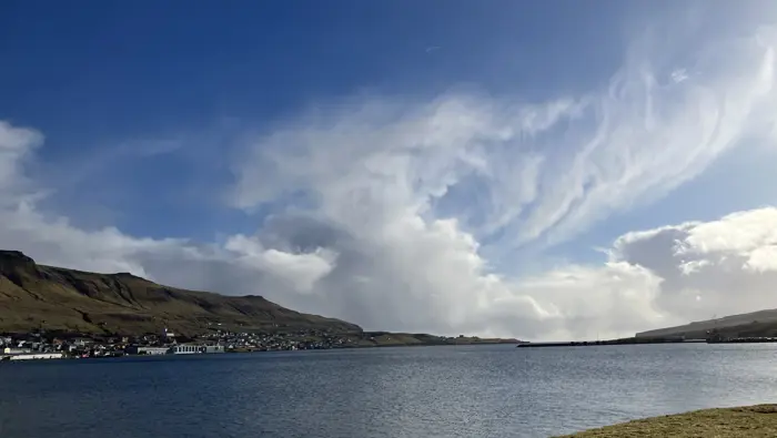 Fyrstu vikuna í mars gingu lágtrýstini beint á okkum. Ofta grátt og vátt, men ímillum lágtrýstini stungu hátrýstryggir seg norðureftir við eitt sindur hugaligari skýlofti. Soleiðis var um morgunin 3. mars. Tað var frískur vindur av útnyrðingi, og tað garðaði á sjónum á Tangafirði. Í erva var smáskýggjað við sól ella sólglottum. Mynd: Tórhallur Thomsen.