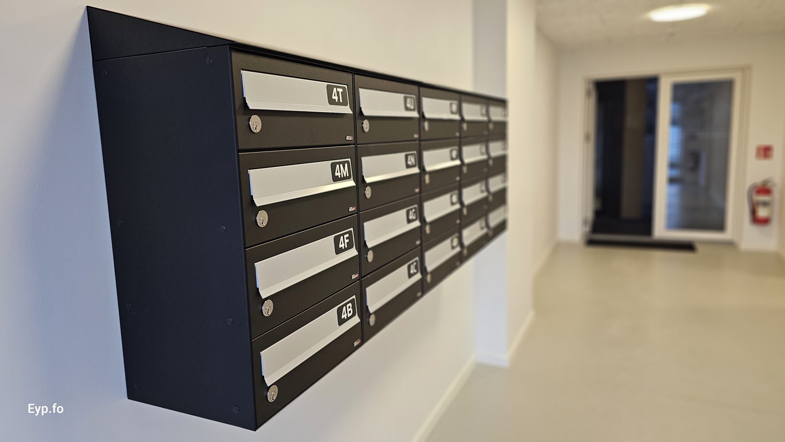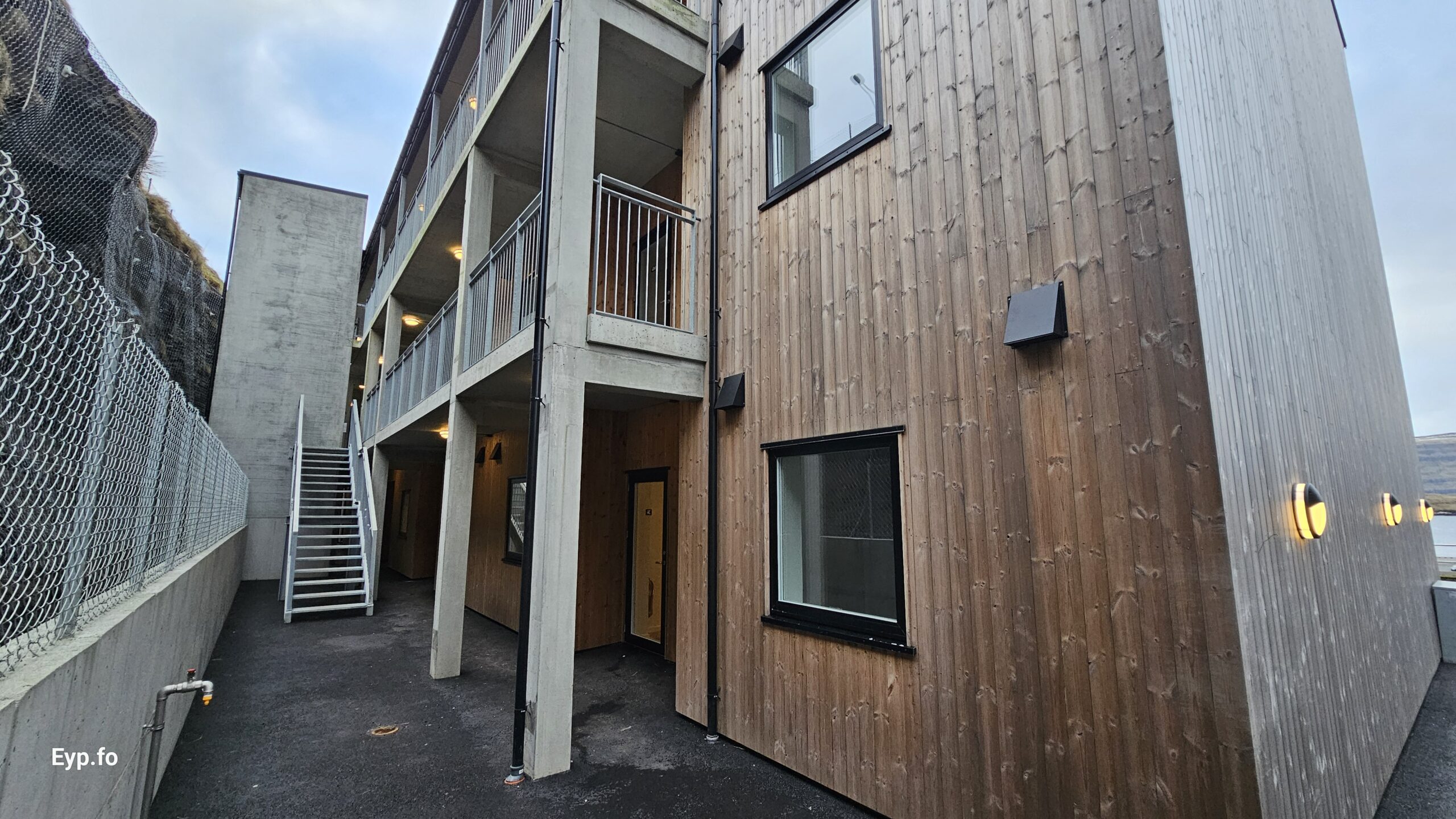 Aftanfyri bygningin er eitt elevatortorn, trappur og svalagongd við atkomu til íbúðirnar. Frammanfyri bygningin eru altanir, terrassur og parkering.