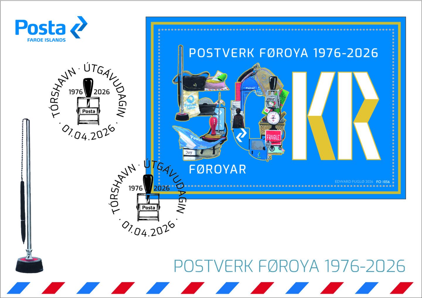 Edward Fuglø hevur sniðgivið snøgga frímerkið, sum hevur eyðkenda bláa Posta-litin, og er prýtt við gullfoliu. Hetta ger arkið til nakað serligt. Frímerkið myndar eina kollasju í skapi sum talið 50 samansett av gerandis brúkslutum, sum nýttir eru í samskiftinum við viðskiftafólk hjá stovninum ígjøgnum árini – frá fyrstu frímerkjunum í 1976 til nýmótans Posta-appina. Millum lutirnar sæst eisini tann eyðkendi hvíti rúsdrekkakassin.