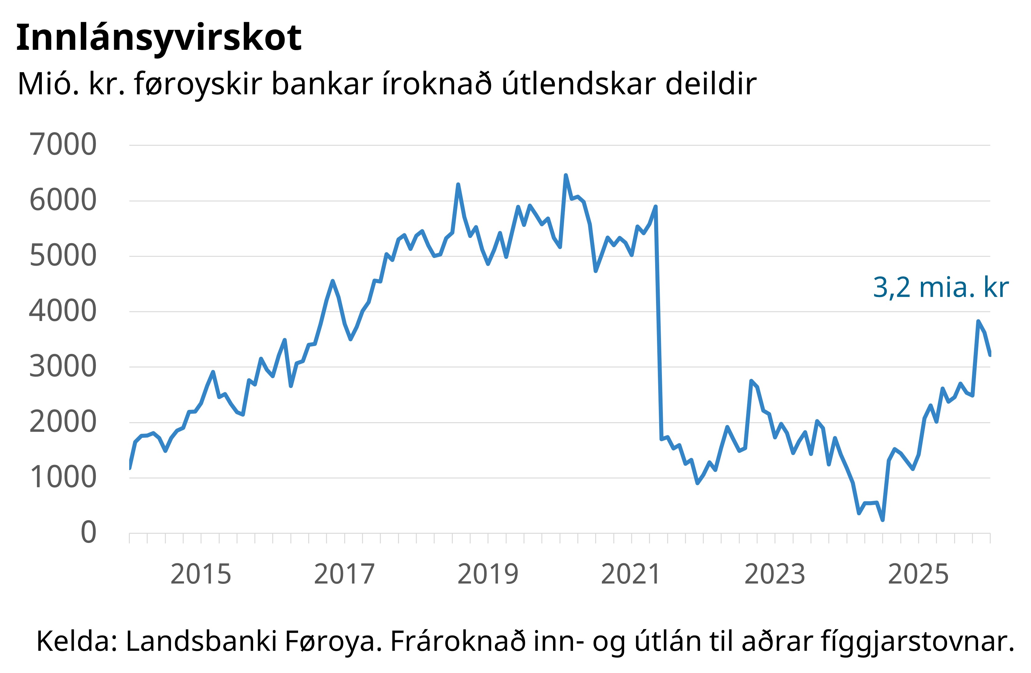 Innlánsyvirskotið í føroysku peningastovnunum var 3,2 mia. kr. í september 2025.  Innlánsyvirskotið er innlán (uppsparing) í føroyskum peningastovnunum íroknað útlendskar deildir, frátrekt útlán hjá somu. Innlánsyvirskotið vaks við meir enn 1 mia. kr. í tíðarskeiðinum juni til juli 2025, sí mynd 1.