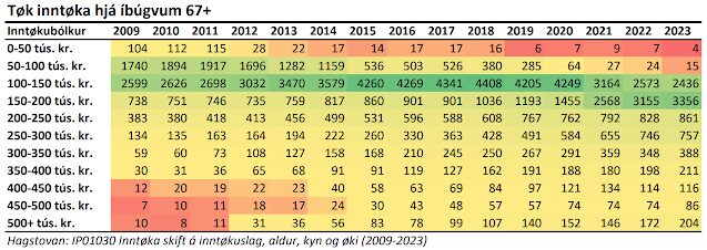 Hetta er onkursvegna “politiskt ókorrekt” at siga, tí í føroyska eldradiskursinum verða pensjónistar ofta umtalaðir sum neyðardýr – so mikið ofta at tað nærum verður sæð sum ein sannleiki. Men veruleikin er meiri fjølbroyttur enn so. Eg havi lagt eina mynd av inntøkubýtinum hjá føroyingum í pensjónsaldri (67+) við. Talan er um tøka inntøku, tvs. inntøkur eftir skatt og gjøld. Hagstovan skrivar í viðmerkingum til talvuna, at hesar inntøkur eru taldar við: “ – Løn fyri arbeiði og yvirskot frá egnum virki. – Veitingar frá tí almenna, so sum pensjón, dagpeningur og lestrarstudningur. – Ognarinntøka, so sum rentuinntøkur og virðisbrævavinningur o.a. kapitalinntøkur”
