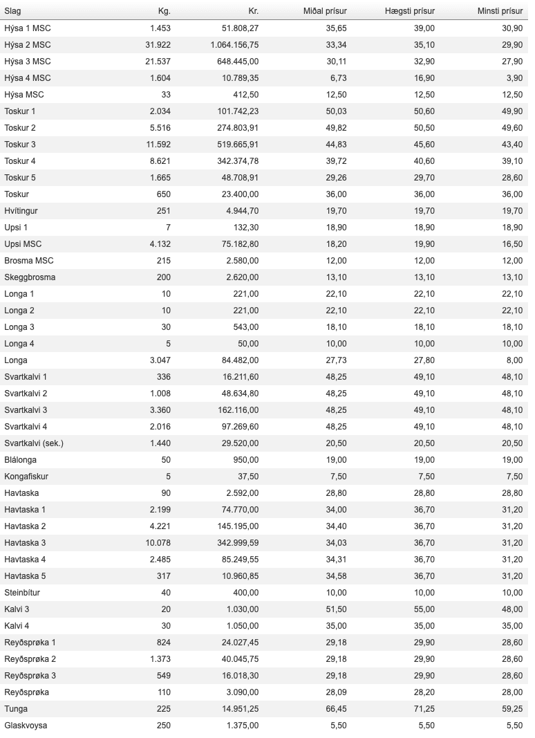 Prísir á Fiskamarknaðinum Føroya 12. februar.