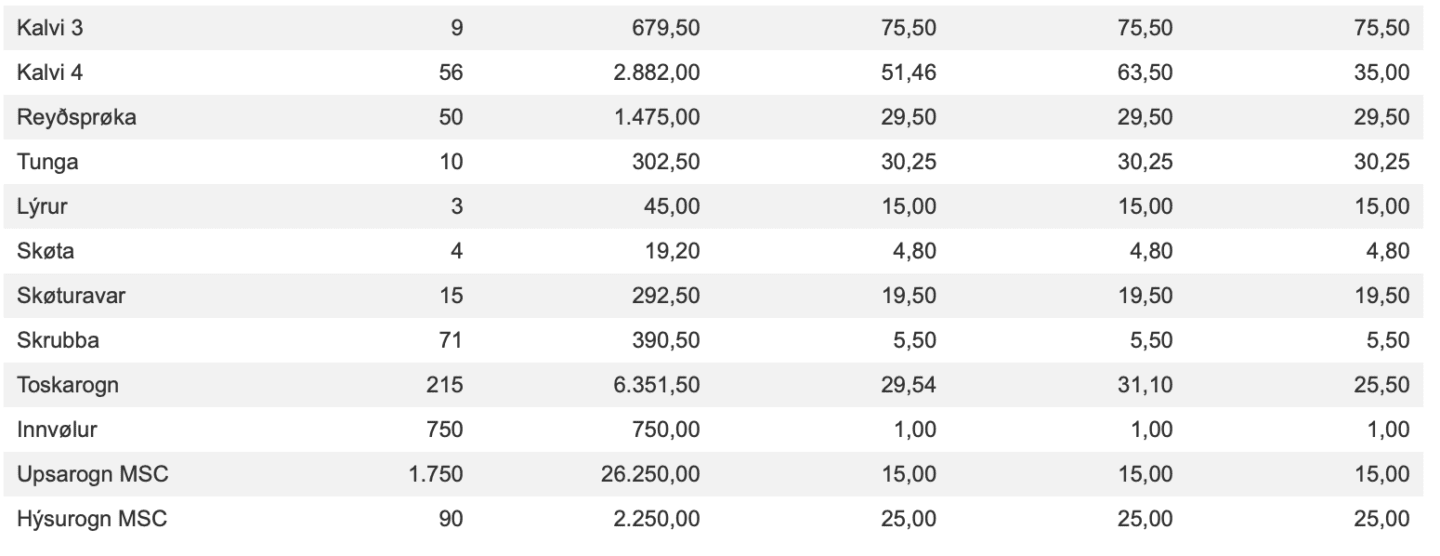Prísir á Fiskamarknaðinum Føroya 13. februar.