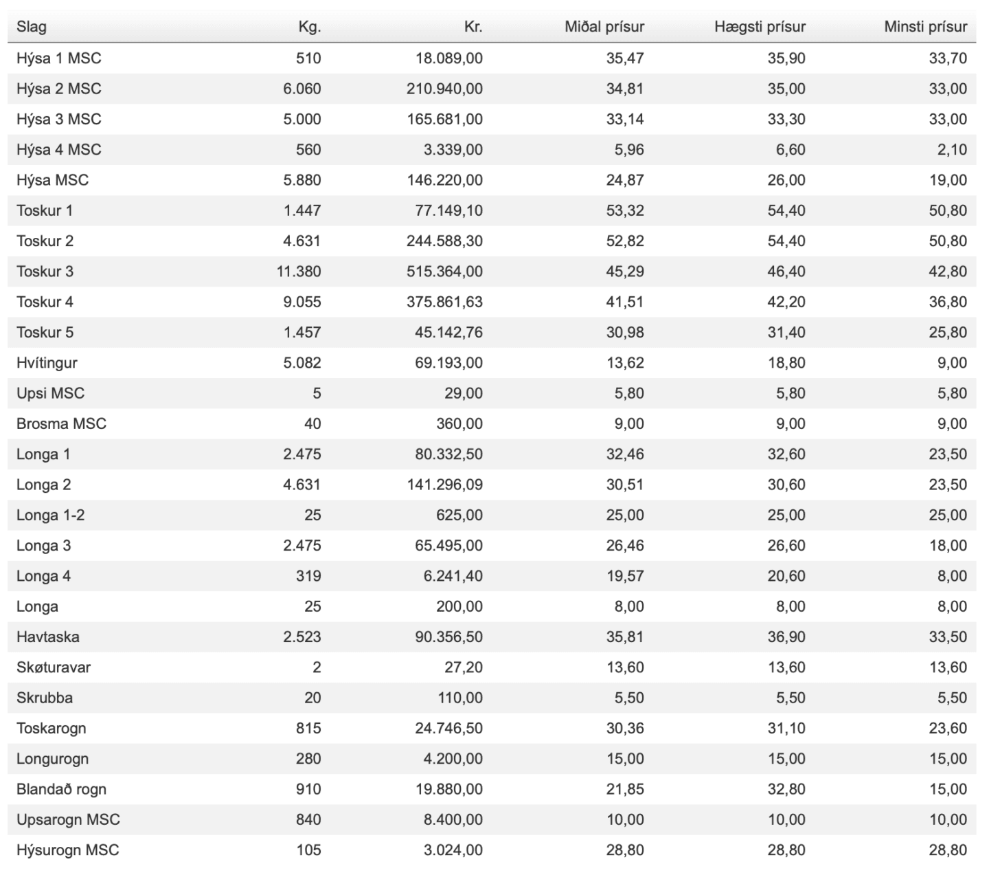 Prísir á Fiskamarknaðinum Føroya 13. mars.