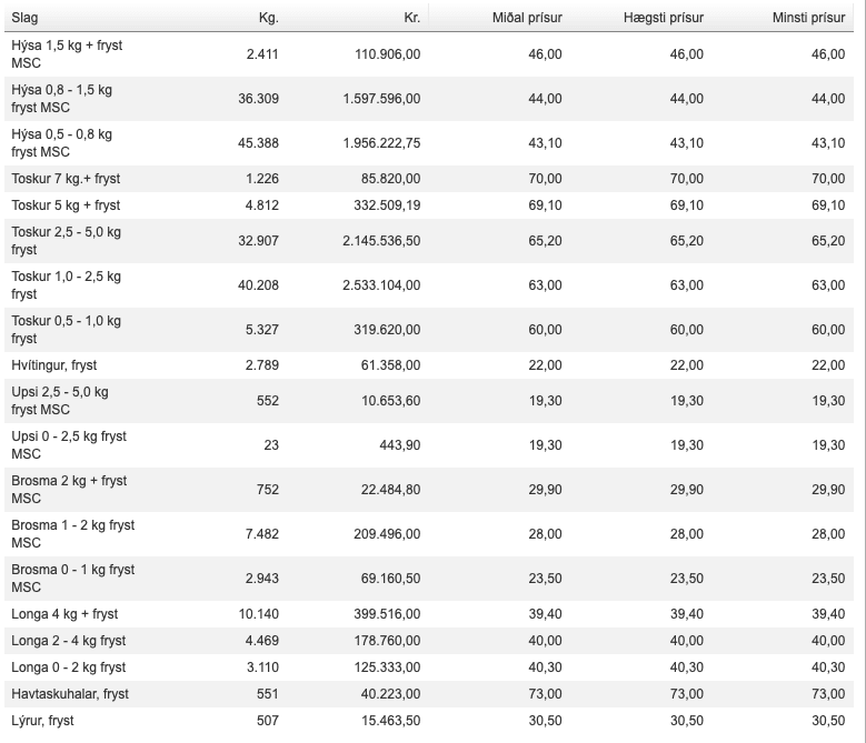Prísir á Fiskamarknaðinum Føroya 17. februar.