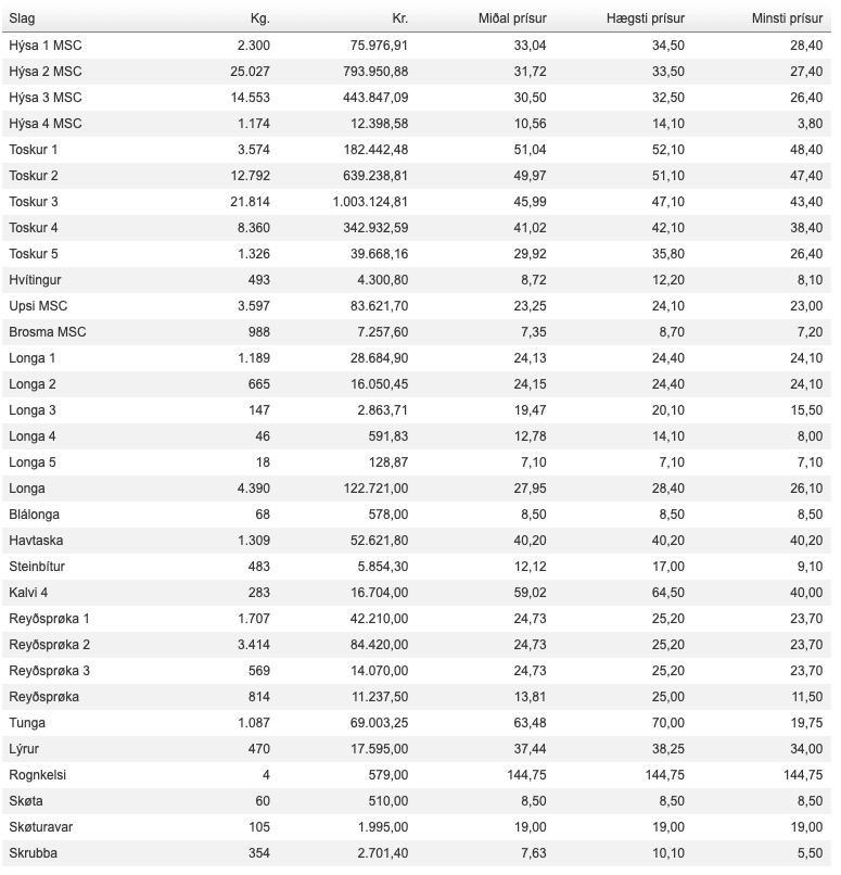 Prísir á Fiskamarknaðinum 18. mars