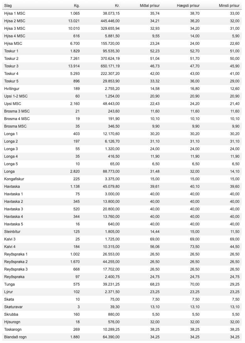 Prísir á Fiskamarknaðinum Føroya 19. mars.