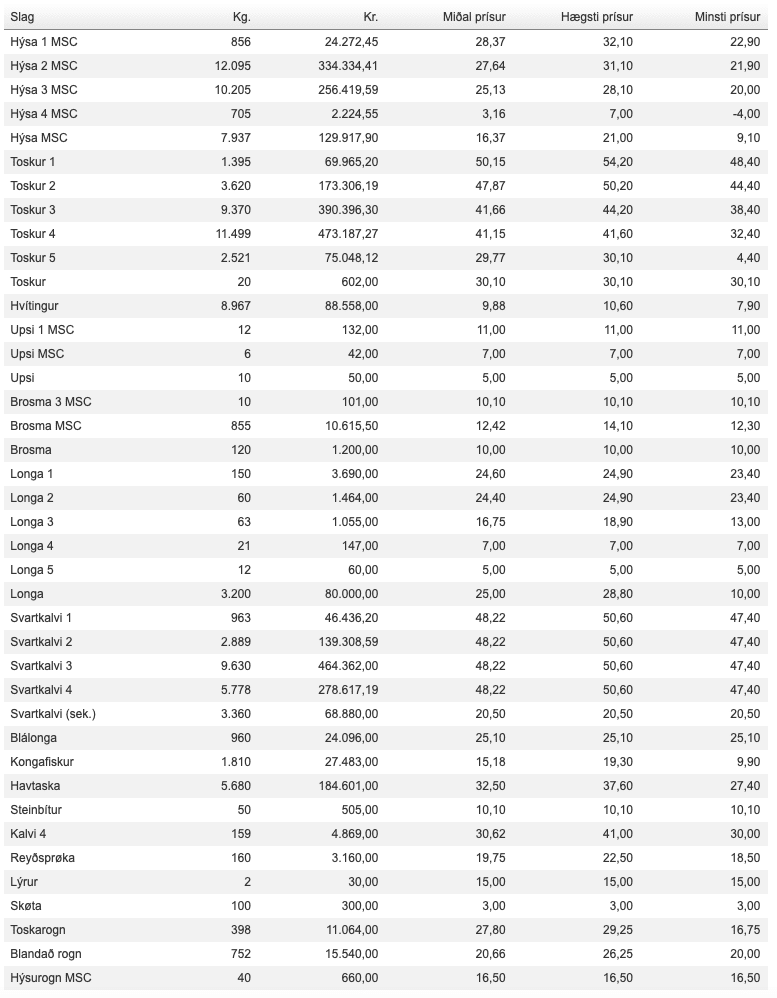 Prísir á Fiskamarknaðinum Føroya 2. mars.