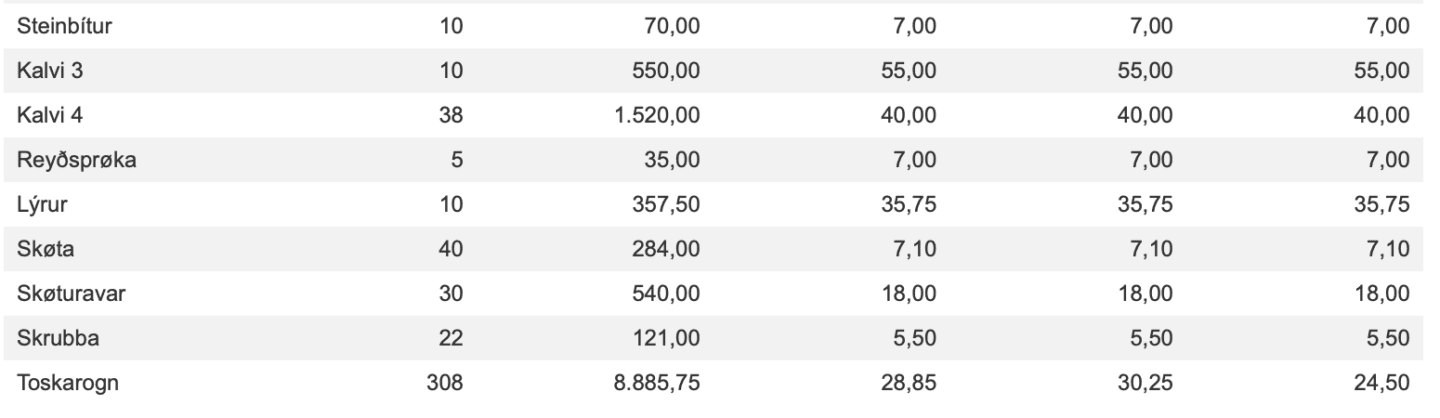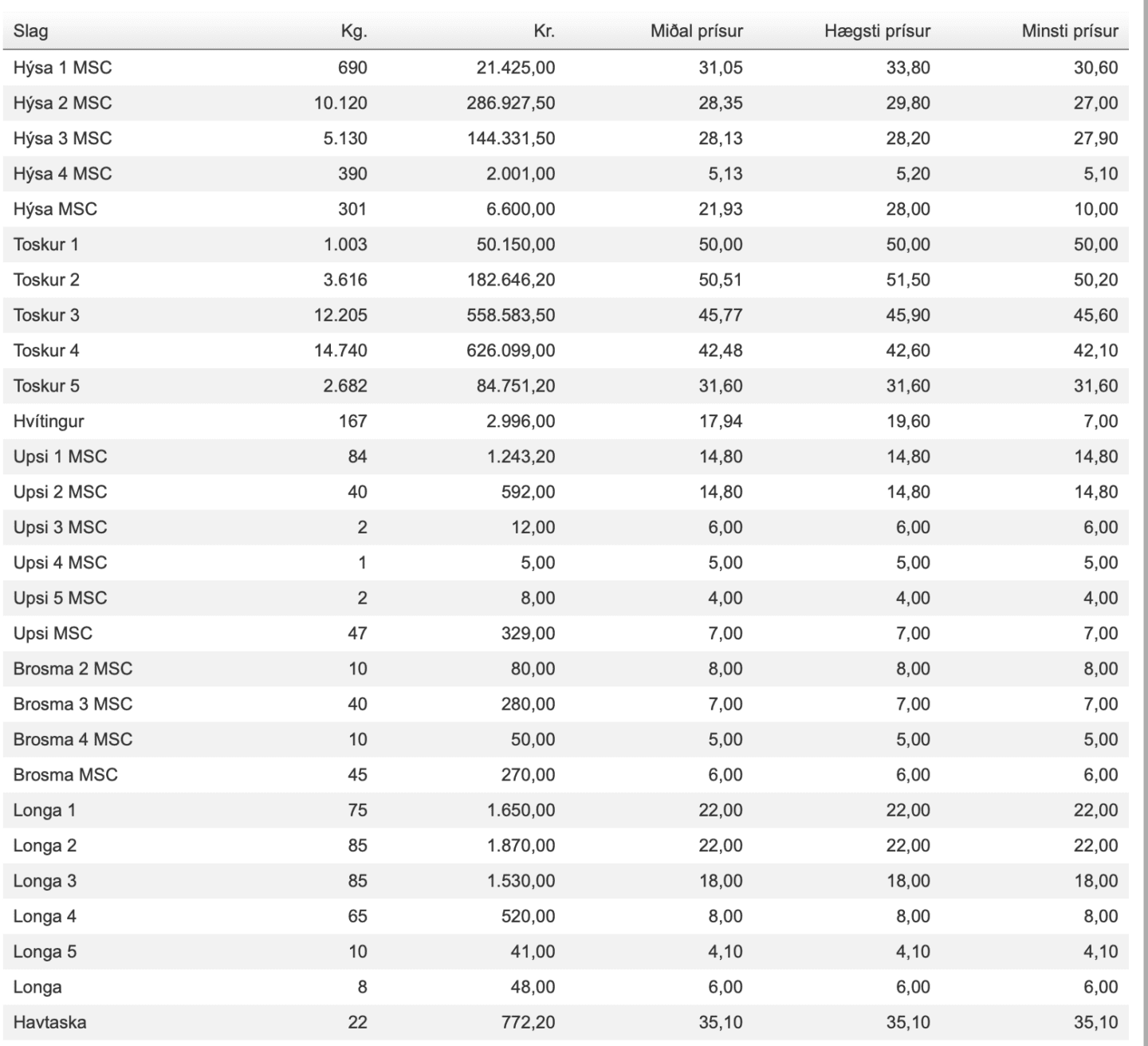 Prísir á Fiskamarknaðinum 20. februar