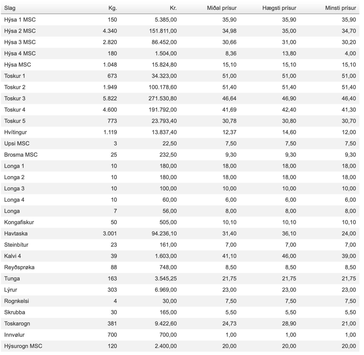 Prísir á Fiskamarknaðinum Føroya 24. februar.