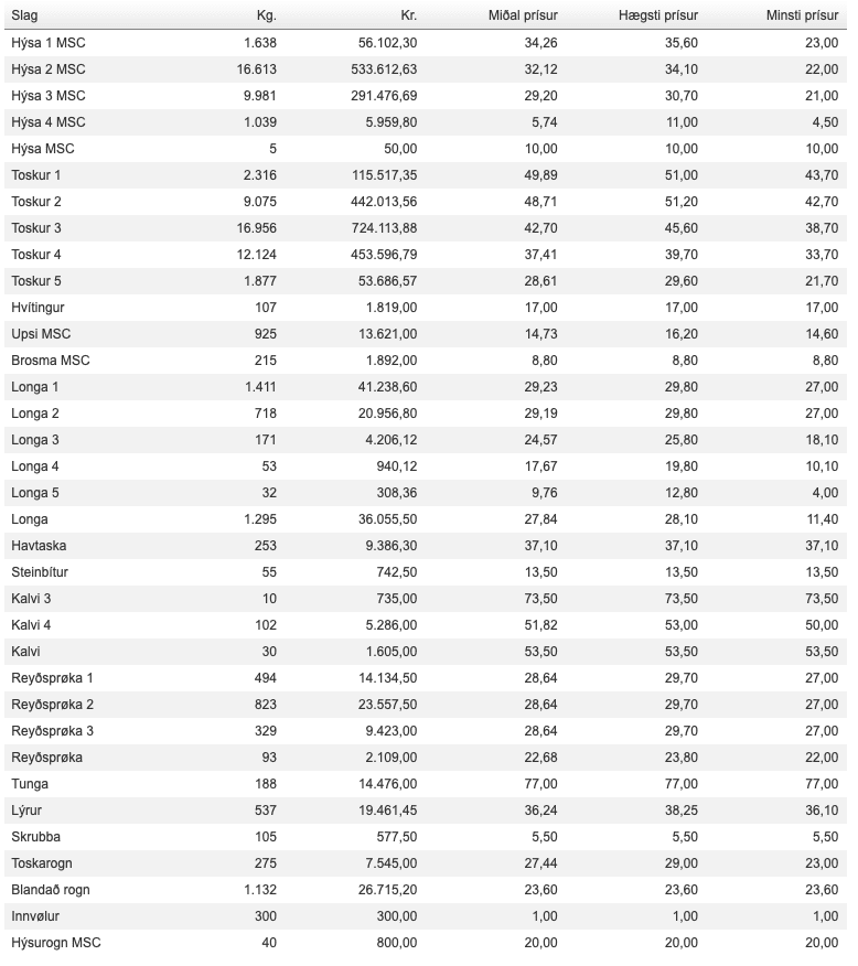 Prísir á Fiskamarknaðinum 26. februar