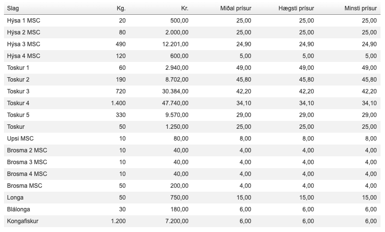Prísir á Fiskamarknaðinum 31. mars