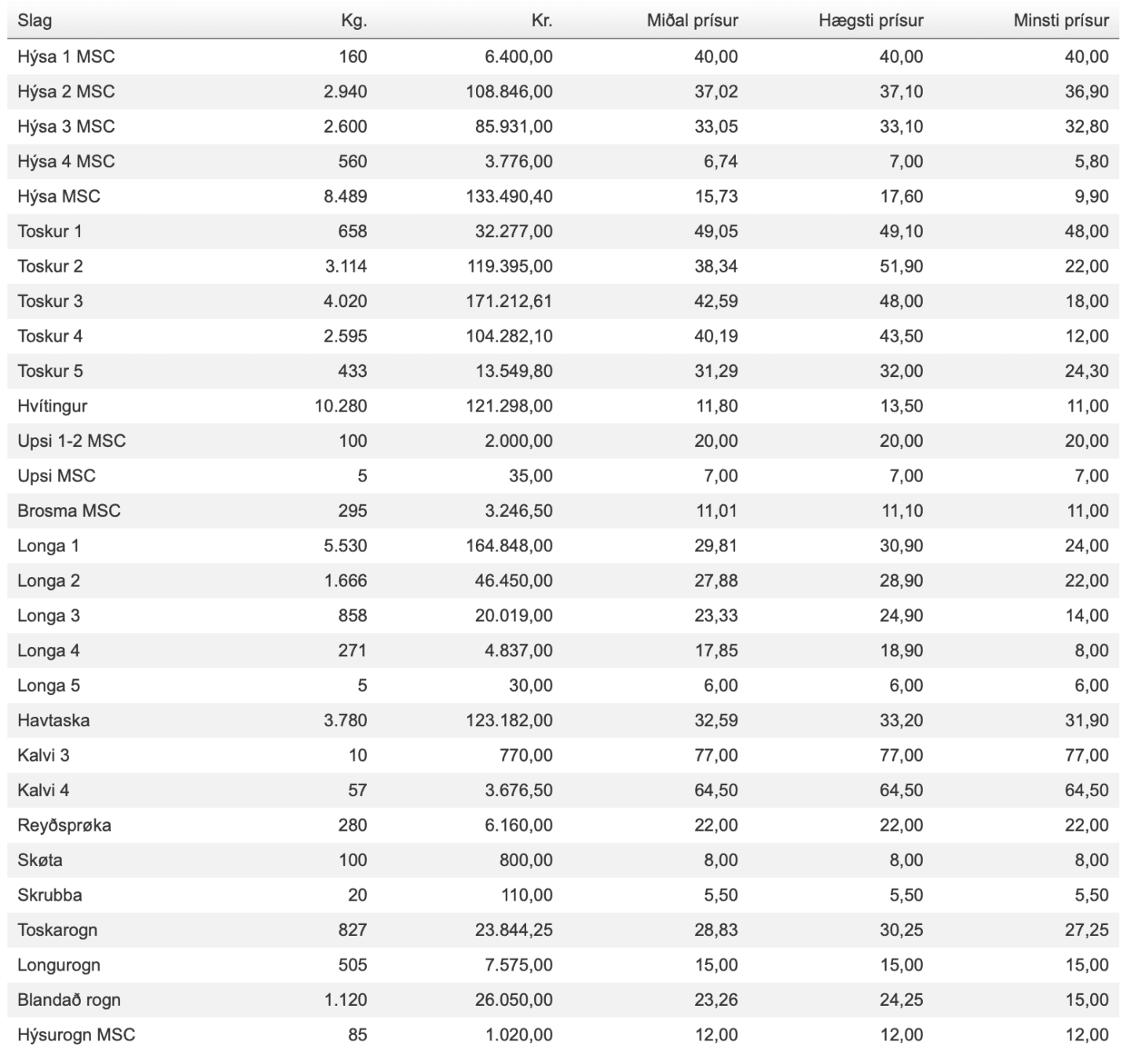 Prísir á Fiskamarknaðinum 6. mars