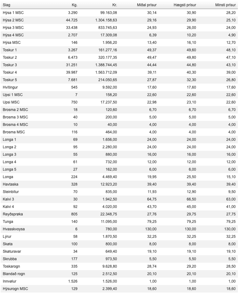 Prísir á Fiskamarknaðinum Føroya 9. februar.