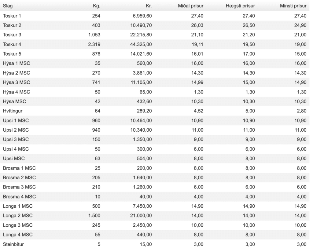 Prísir frá Fiskamarknaður Føroya í dag 01. mai.