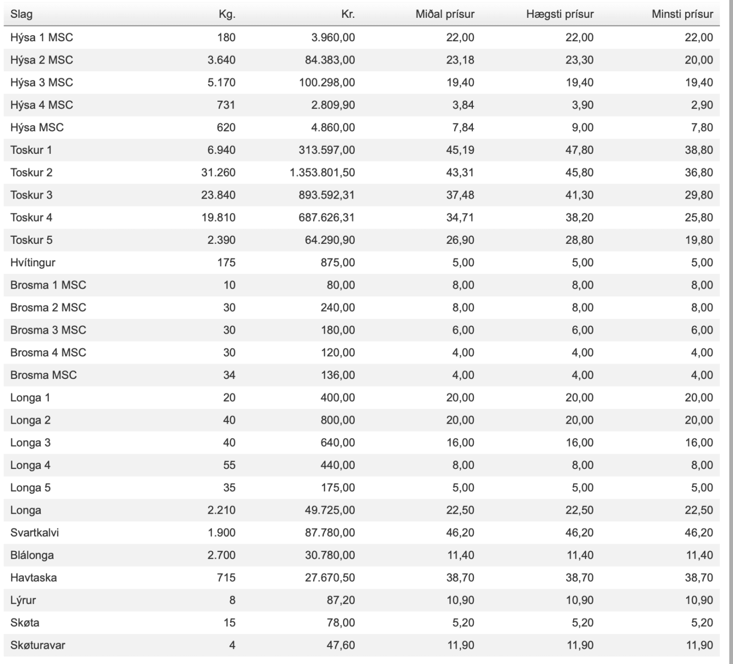 Prísir frá Fiskamarknaður Føroya 1. desember