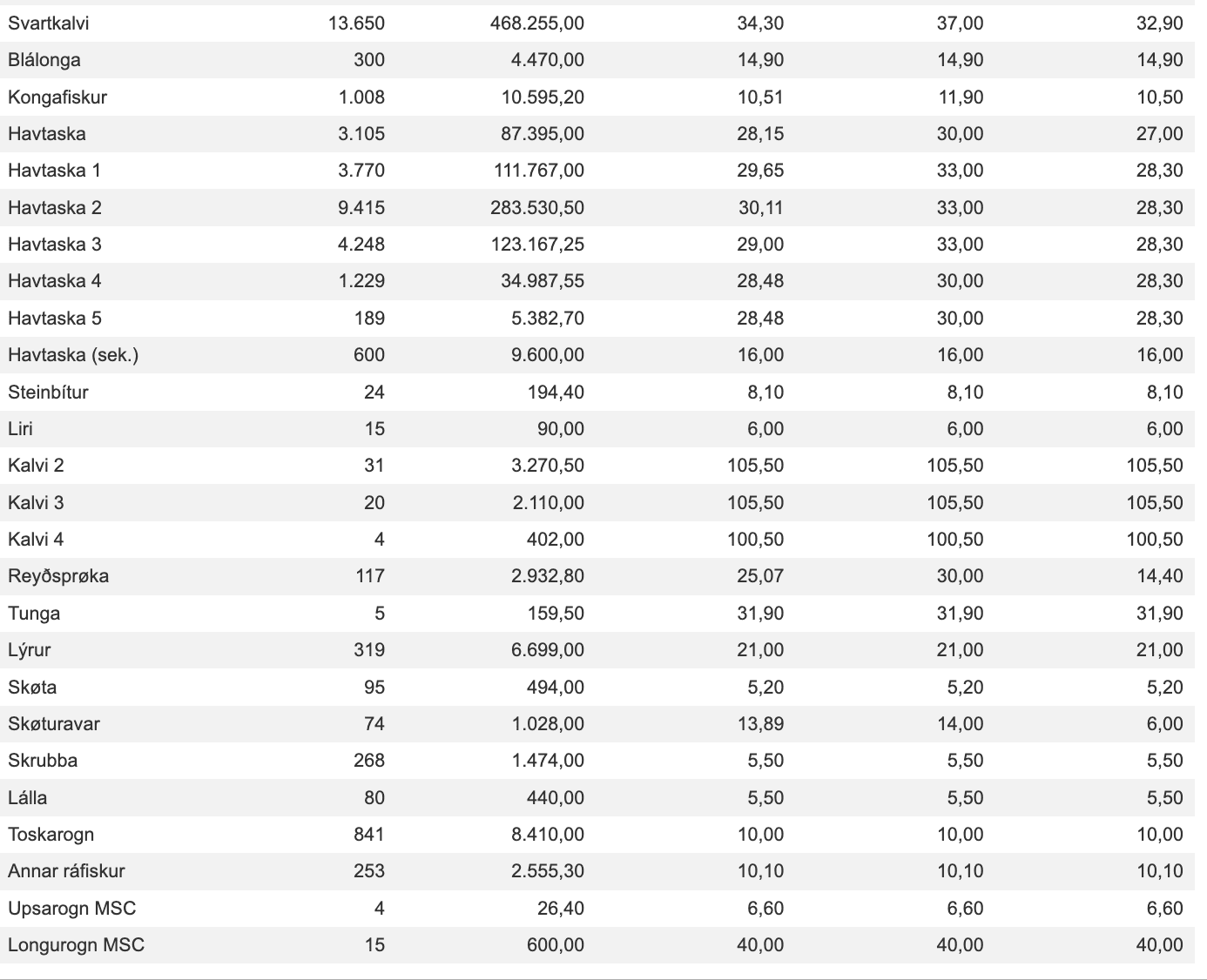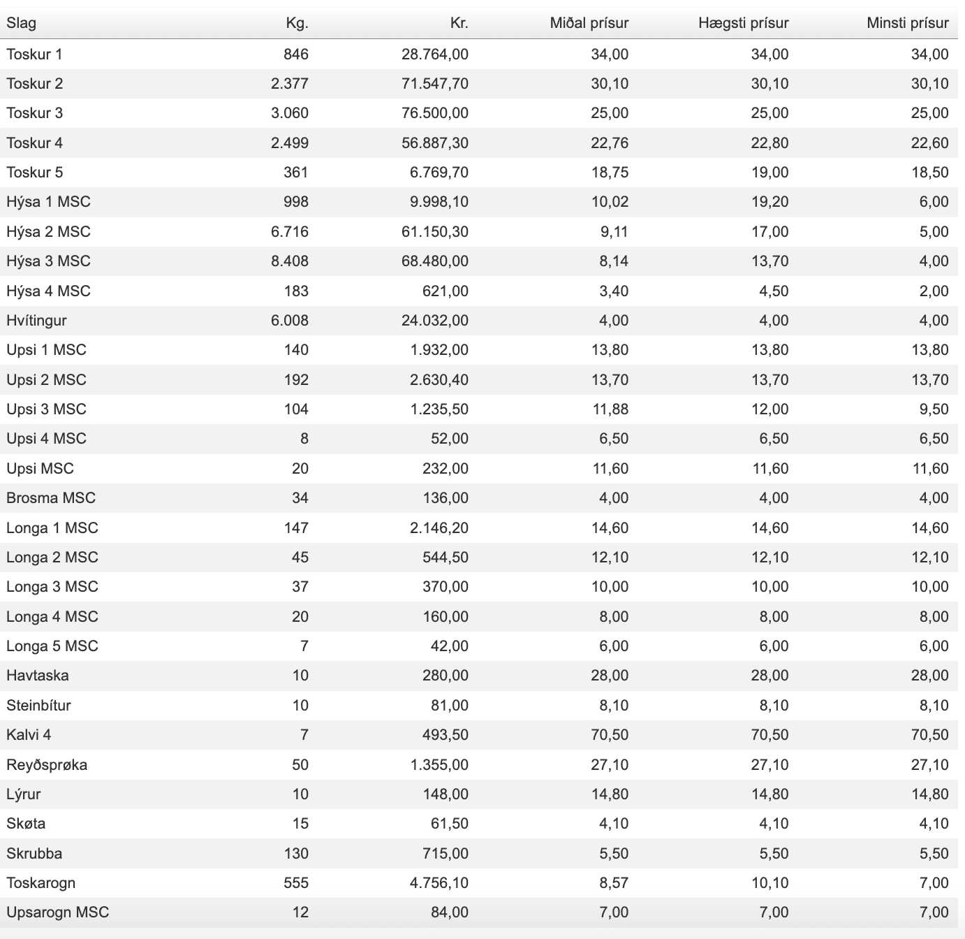 Prísir frá Fiskamarknaður Føroya í dag 1. mars.